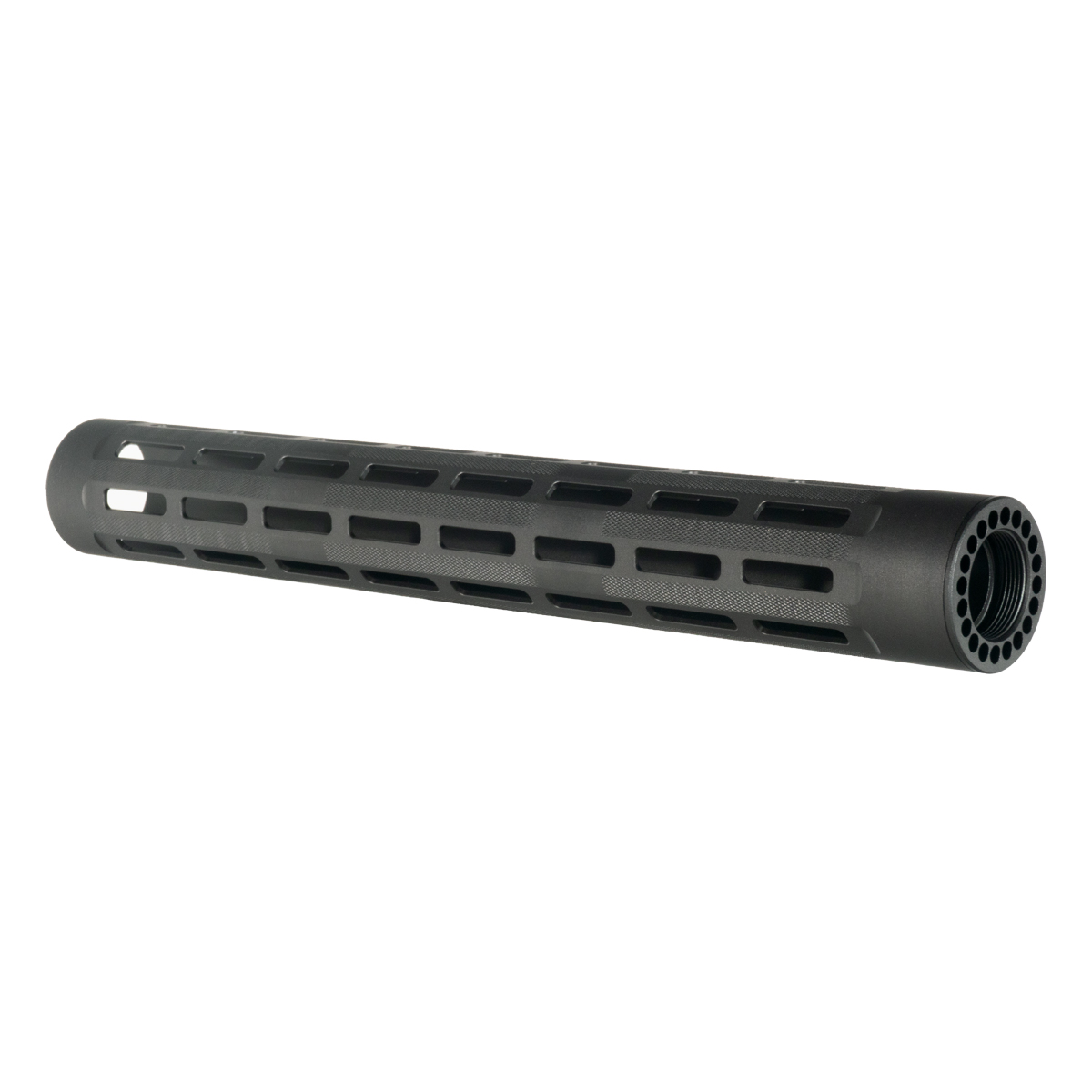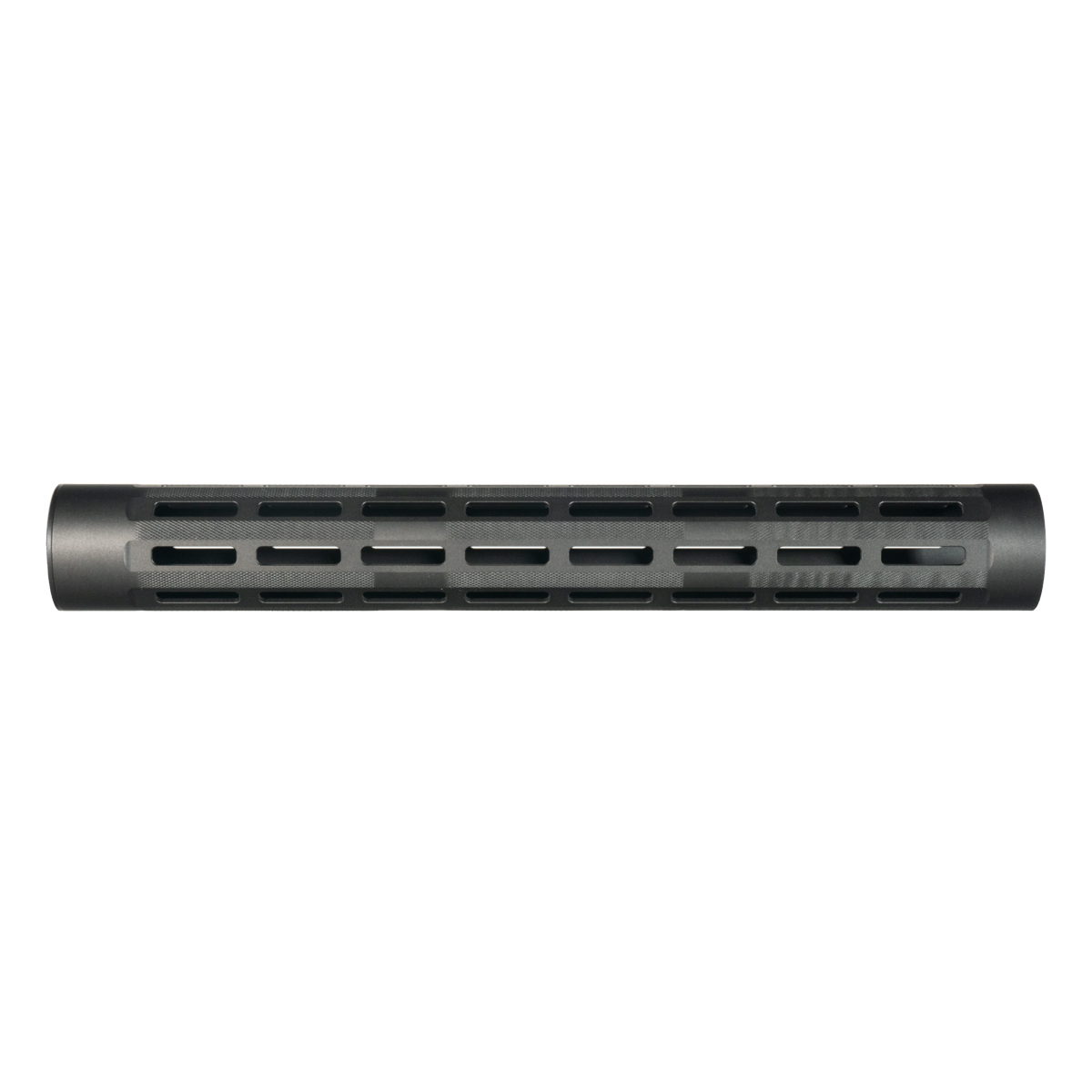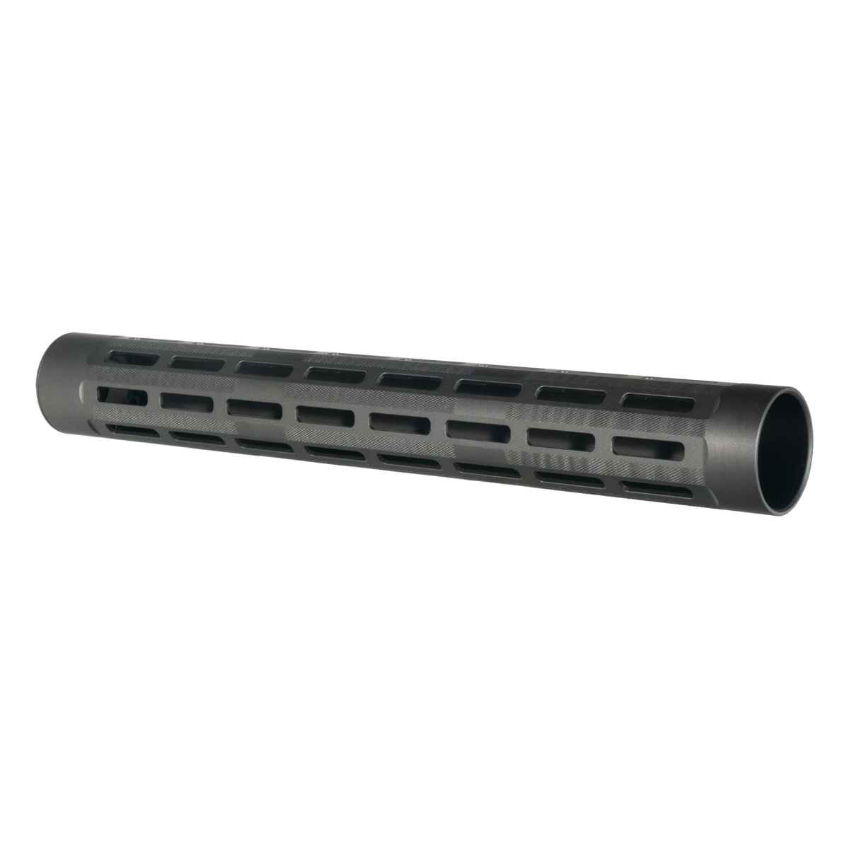 This 15 inch tubular handguard features 360 degree M-Lok slots for modular accessory placement at any position. Constructed from aluminum with black finish. The 1.77 inch internal diameter accommodates suppressors and provides clearance for various barrel profiles. Knurled sections provide enhanced grip surface. Compatible with AR-15 platforms.