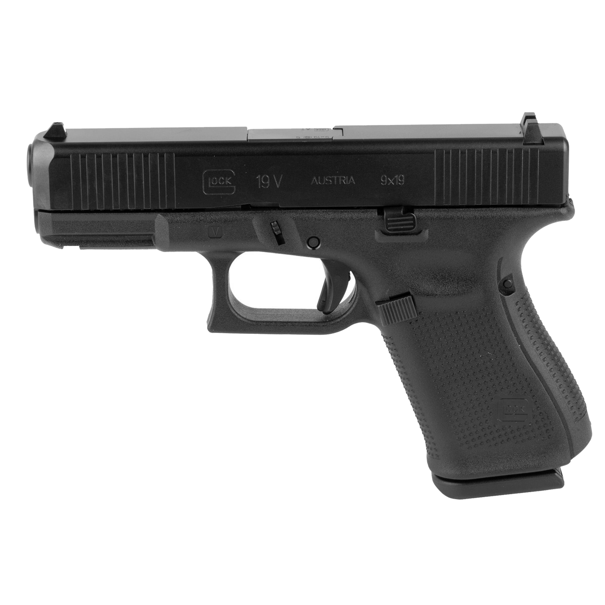The Glock 19V Gen5 features polymer frame construction with black nDLC matte finish and striker-fired Safe Action system. This semi-automatic pistol is chambered in 9mm with a 4.02-inch Glock Marksman barrel and 7.28-inch overall length. The pistol includes fixed Glock sights, front slide serrations, and three 15-round magazines. Weight is 23.63 ounces.