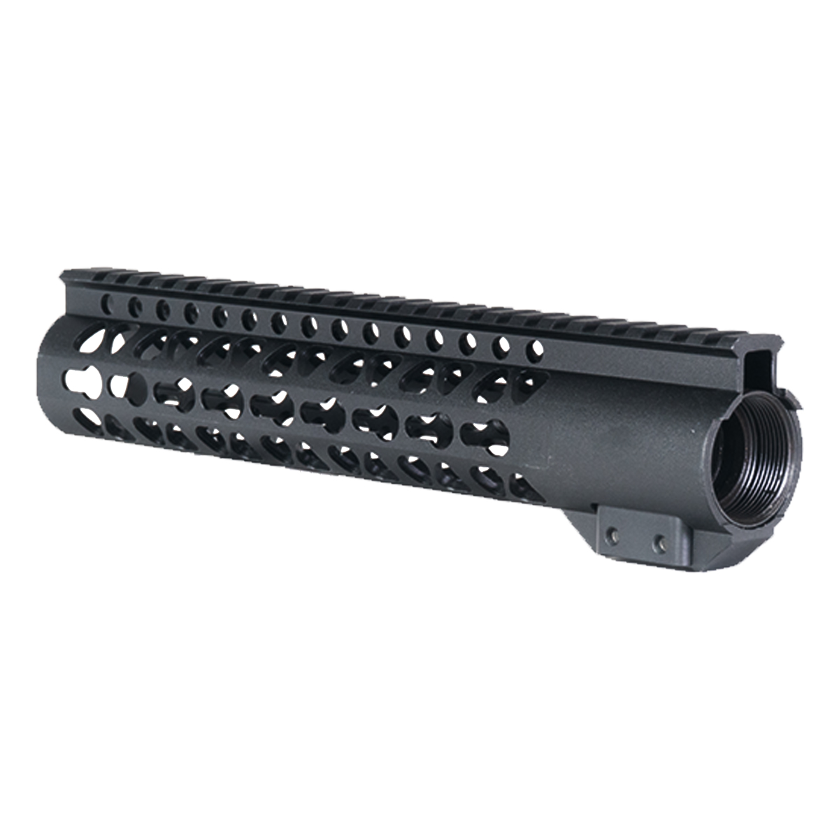 The KeyMod attachment system with multiple contact points on sides and bottom provides lightweight, modular mounting for lights, grips, and accessories. Two included 3.25-inch KeyMod rail sections allow immediate Picatinny accessory mounting where needed, while the static top rail remains dedicated for optics.