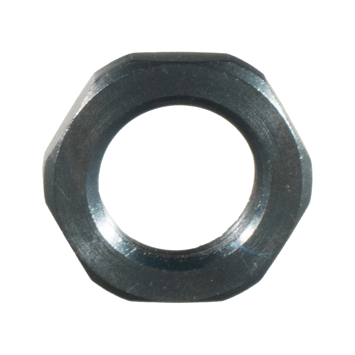 This jam nut provides secure locking for muzzle devices on 1/2x28 threaded barrels. Constructed from black carbon steel with 0.5 inch outside diameter. The jam nut threads behind muzzle devices to prevent loosening during use. Compatible with AR-15 barrels using 1/2x28 thread pitch.