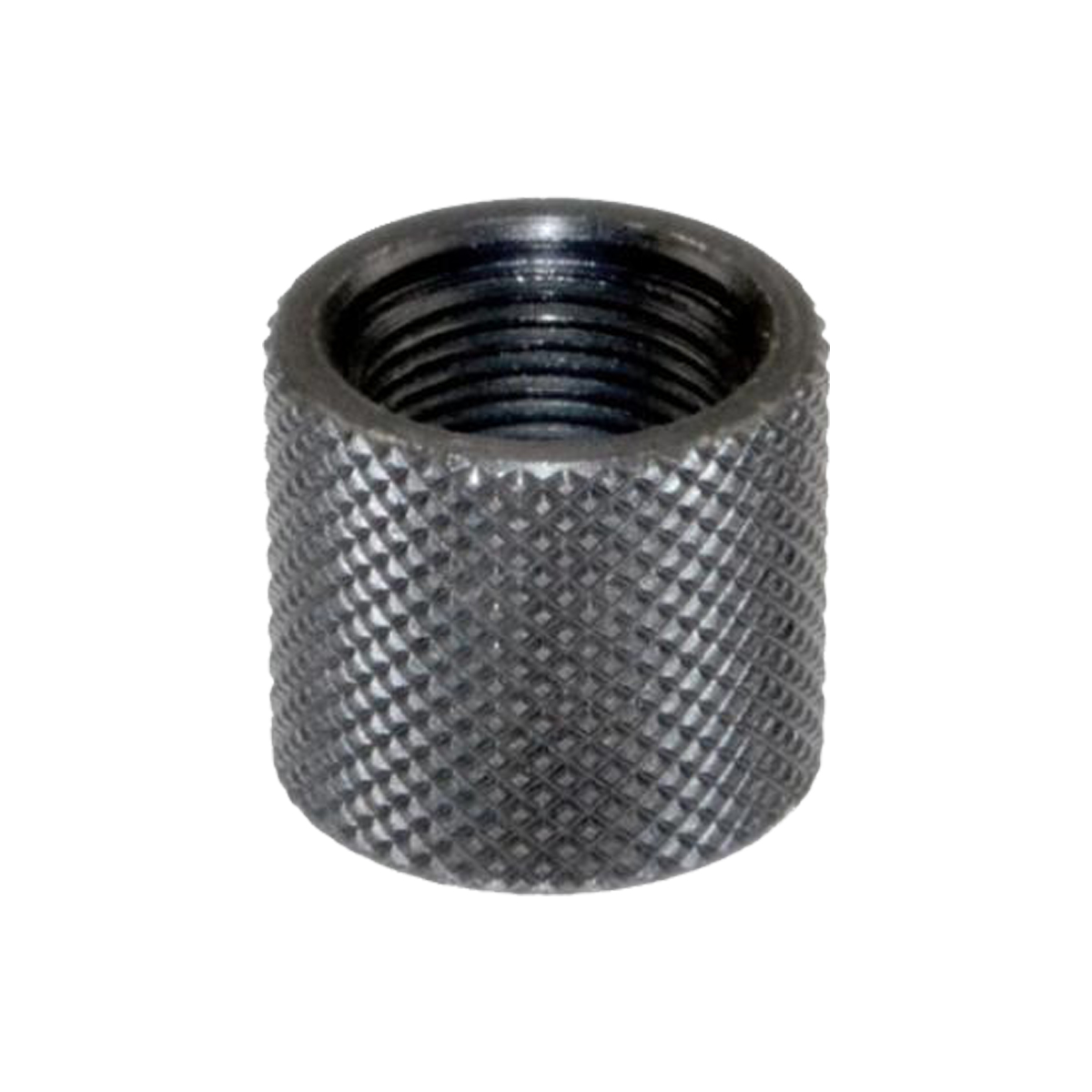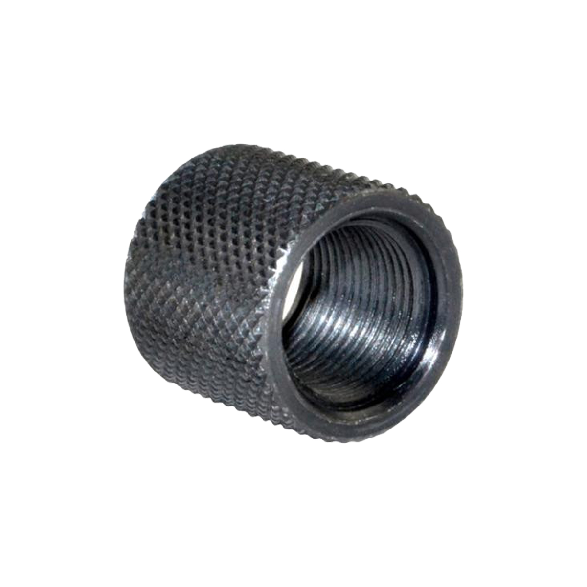 The knurled and textured exterior provides gripping surface for hand tightening the thread protector onto the muzzle threads without requiring tools. The carbon steel construction with black finish provides durability and corrosion resistance. The thread protector prevents damage to muzzle threads during storage, transport, or when muzzle devices are temporarily removed for cleaning or maintenance.