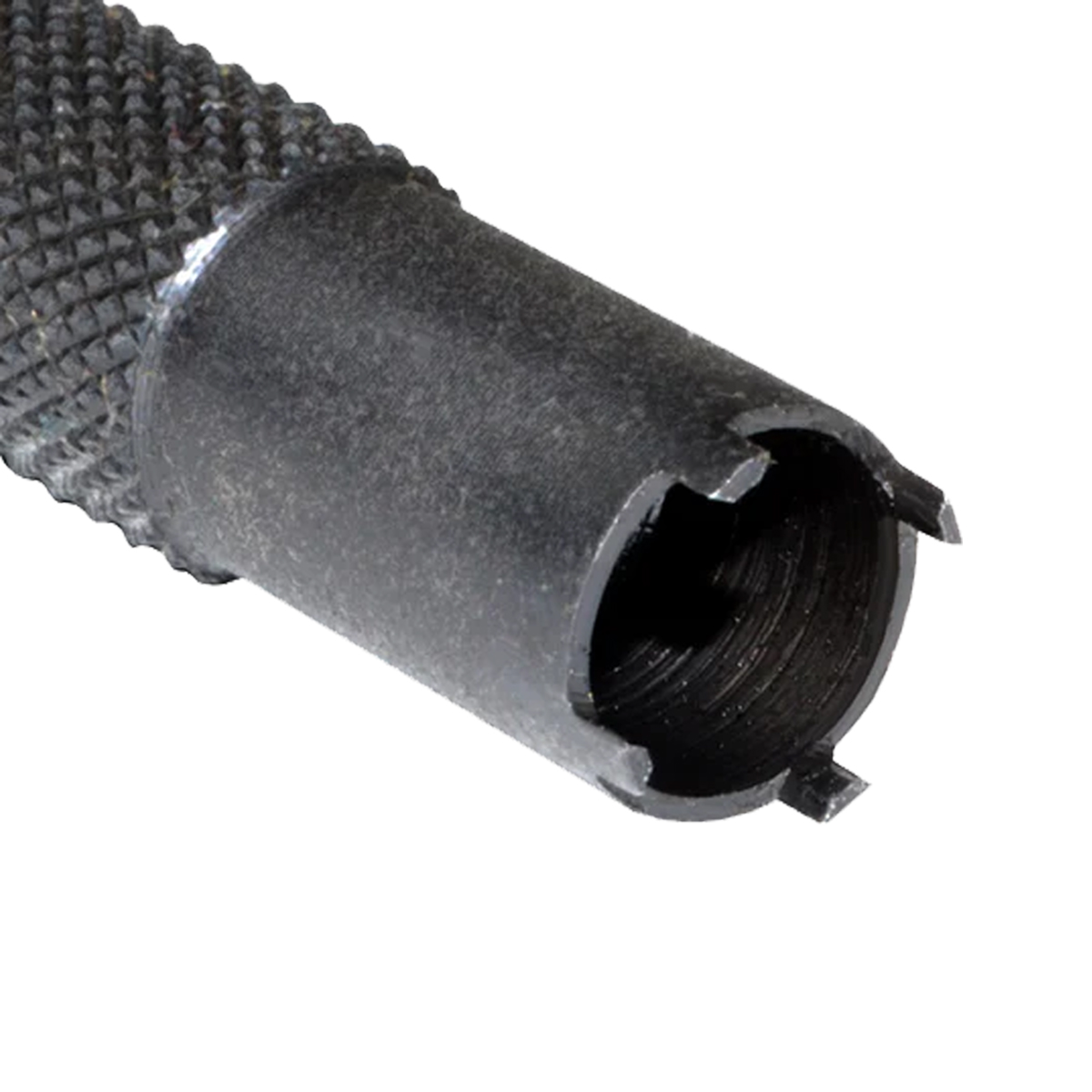 The tool provides compatibility with A1 and A2 front sight posts found on AR platform rifles chambered in .223 and 5.56. A1 front sight posts feature a narrow diameter post with four detent slots. A2 front sight posts feature a wider diameter post with five detent slots. The dual-ended design accommodates both sight post types for elevation adjustment.