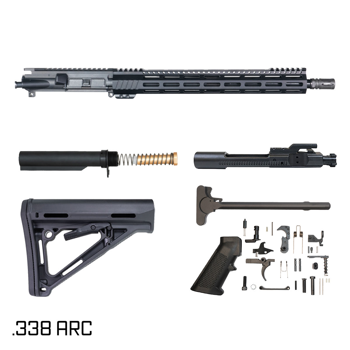 Follow safe handling practices and manufacturer instructions for assembly and use. Ensure compliance with all applicable federal, state, and local laws. Verify compatibility of muzzle devices and accessories with .338 ARC chambering and barrel specifications. This kit includes all necessary components to complete the build—lower receiver sold separately.