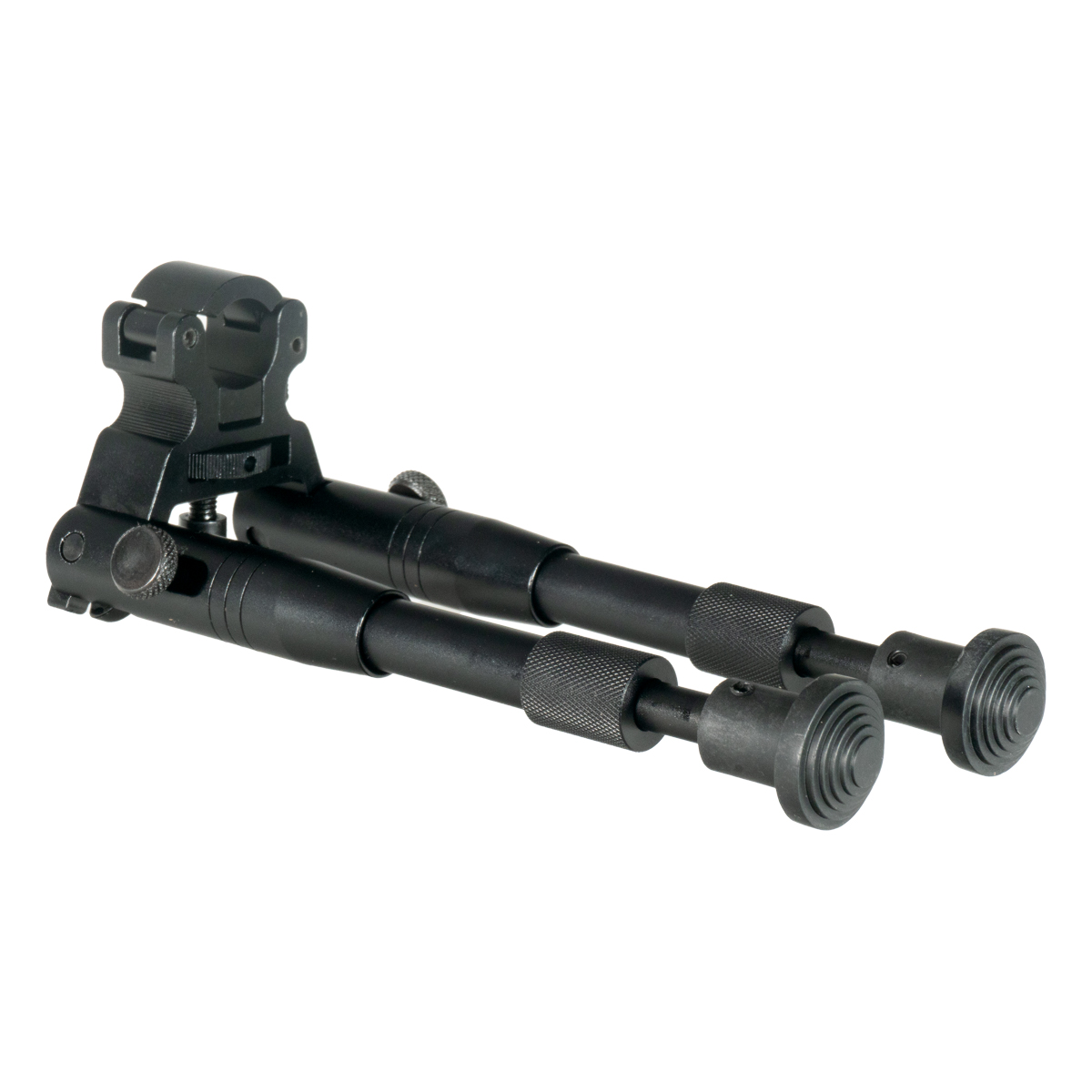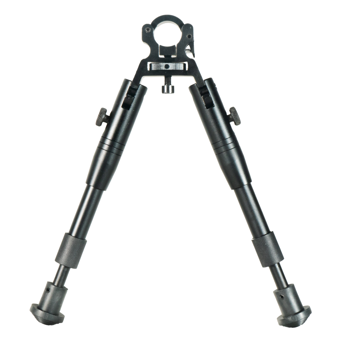 This folding bipod clamps directly onto barrels with diameters ranging from 0.45 to 0.750 inches. Constructed from lightweight aluminum with black finish. The adjustable height ranges from 7 to 8.25 inches for customizable shooting positions. The folding design allows compact storage and transport.