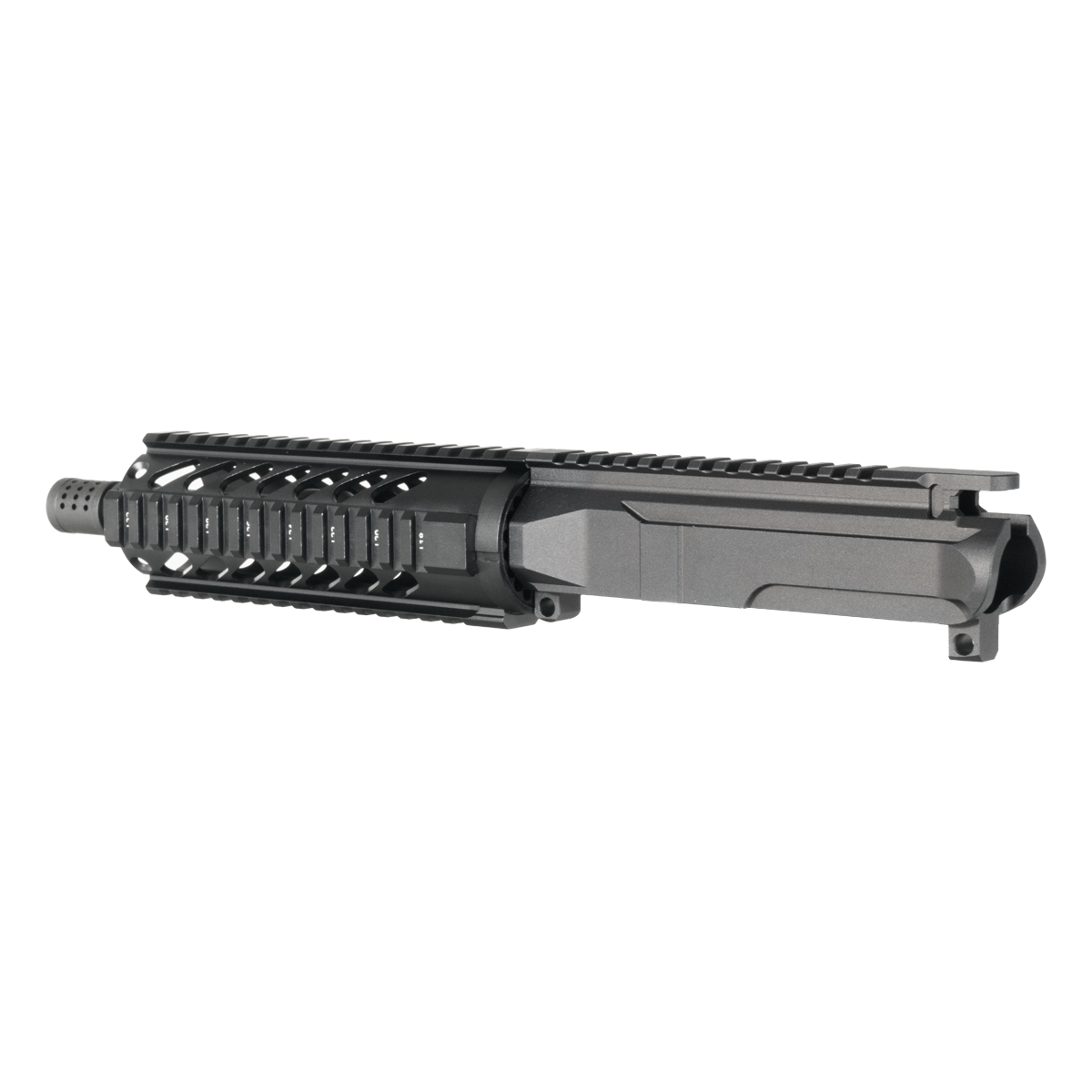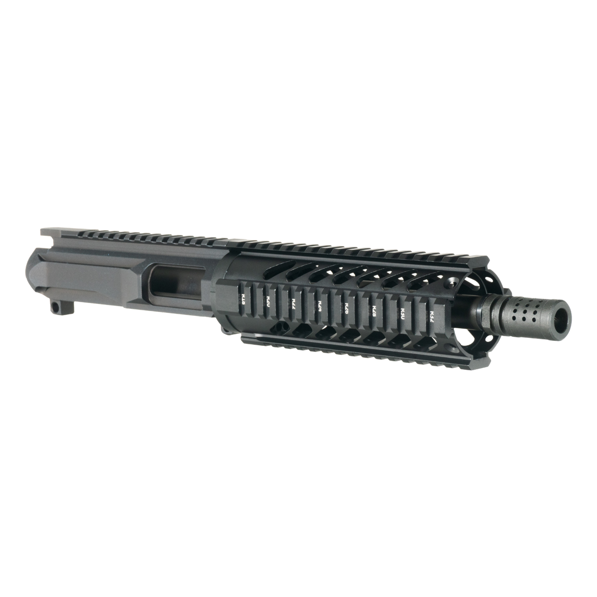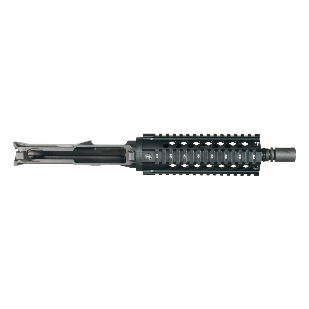 This upper build kit pairs a Bear Creek 7.5 inch 45 ACP barrel with a 7 inch freefloat quad-rail handguard and features a blemished Davidson Defense 9mm billet upper receiver. Designed for compact 45 ACP builds, it includes a KAK Industry 45 ACP compensator and 5/8 inch crush washer. The blemished finish on the upper receiver may show minor cosmetic imperfections that dont affect function.