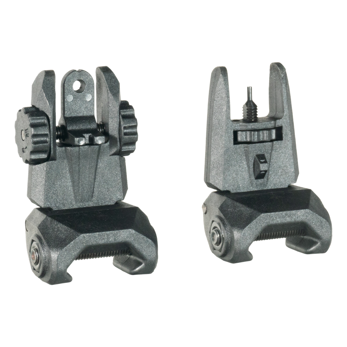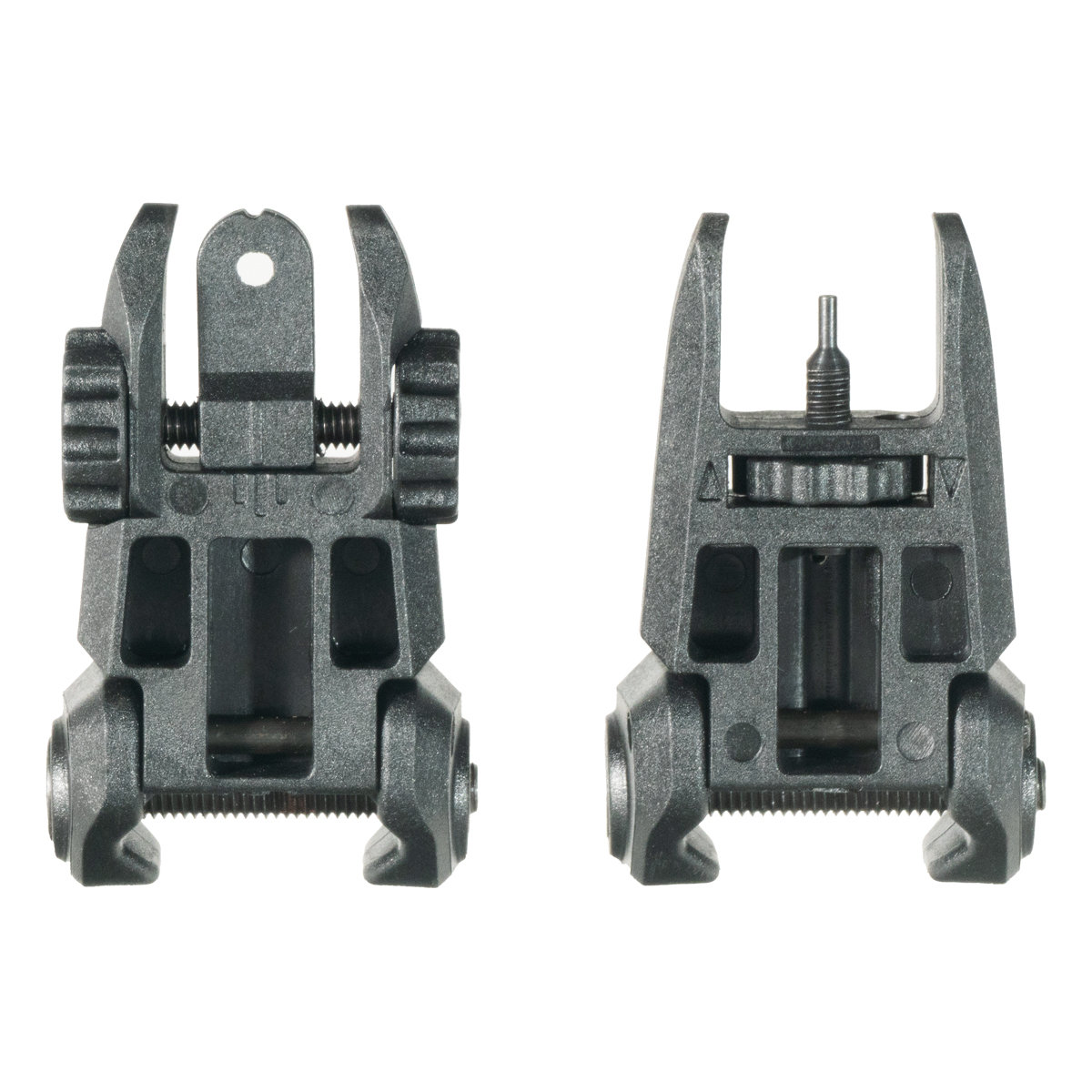 The front and rear sights mount on the same plane, creating a consistent sight picture when deployed. Same plane alignment simplifies sight picture acquisition and reduces the need for significant head position adjustment between front and rear sights. This configuration works effectively on flattop AR-15 platforms with Picatinny rails.
