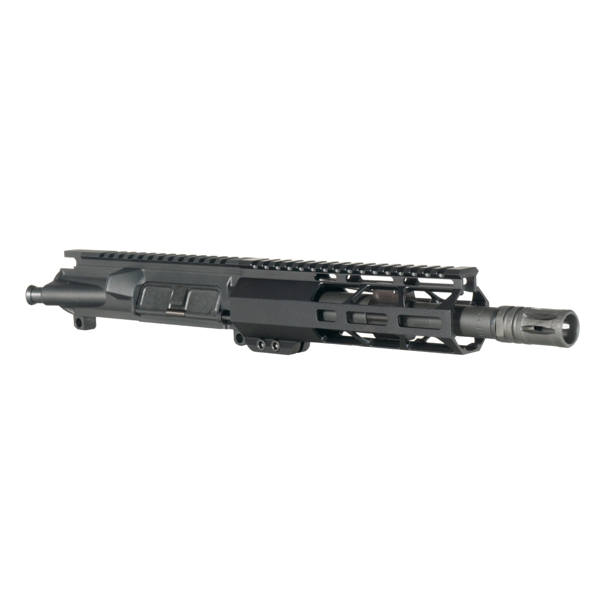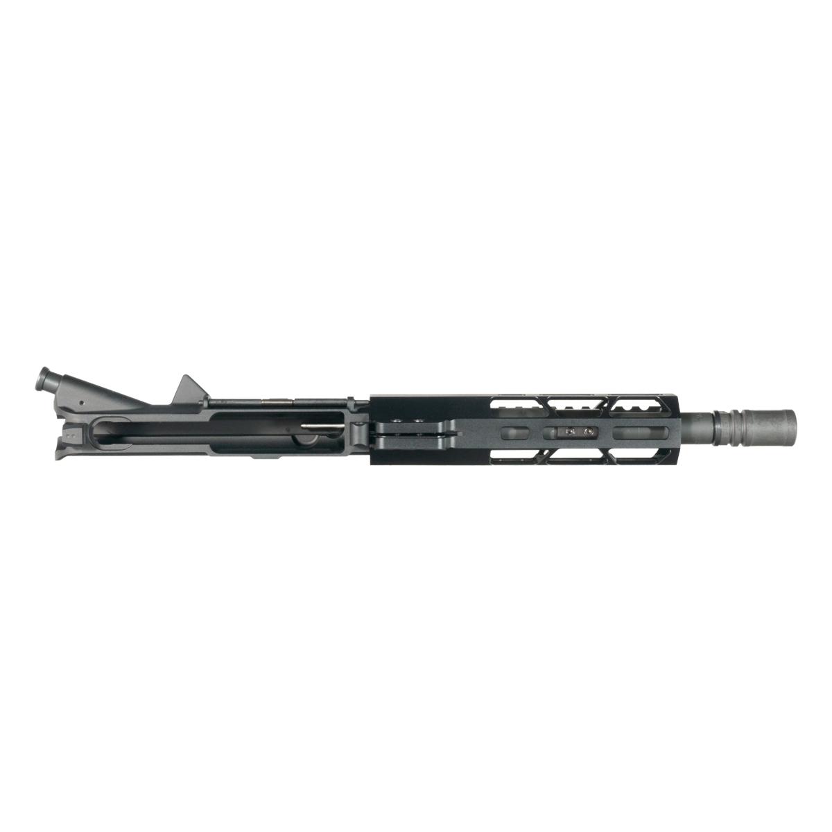 This upper build kit combines an 8.5 inch 300 BLK barrel, 7 inch M-Lok handguard, and pistol gas system in a compact configuration. The upper receiver is forged 7075-T6 aluminum with an anodized finish. The barrel is 4150 Chrome Moly Vanadium with a 1 in 8 twist rate and 5/8x24 threads. The handguard is 6061-T6 aluminum with M-Lok slots for accessory compatibility. A standard AR-15 GI birdcage flash hider is included.