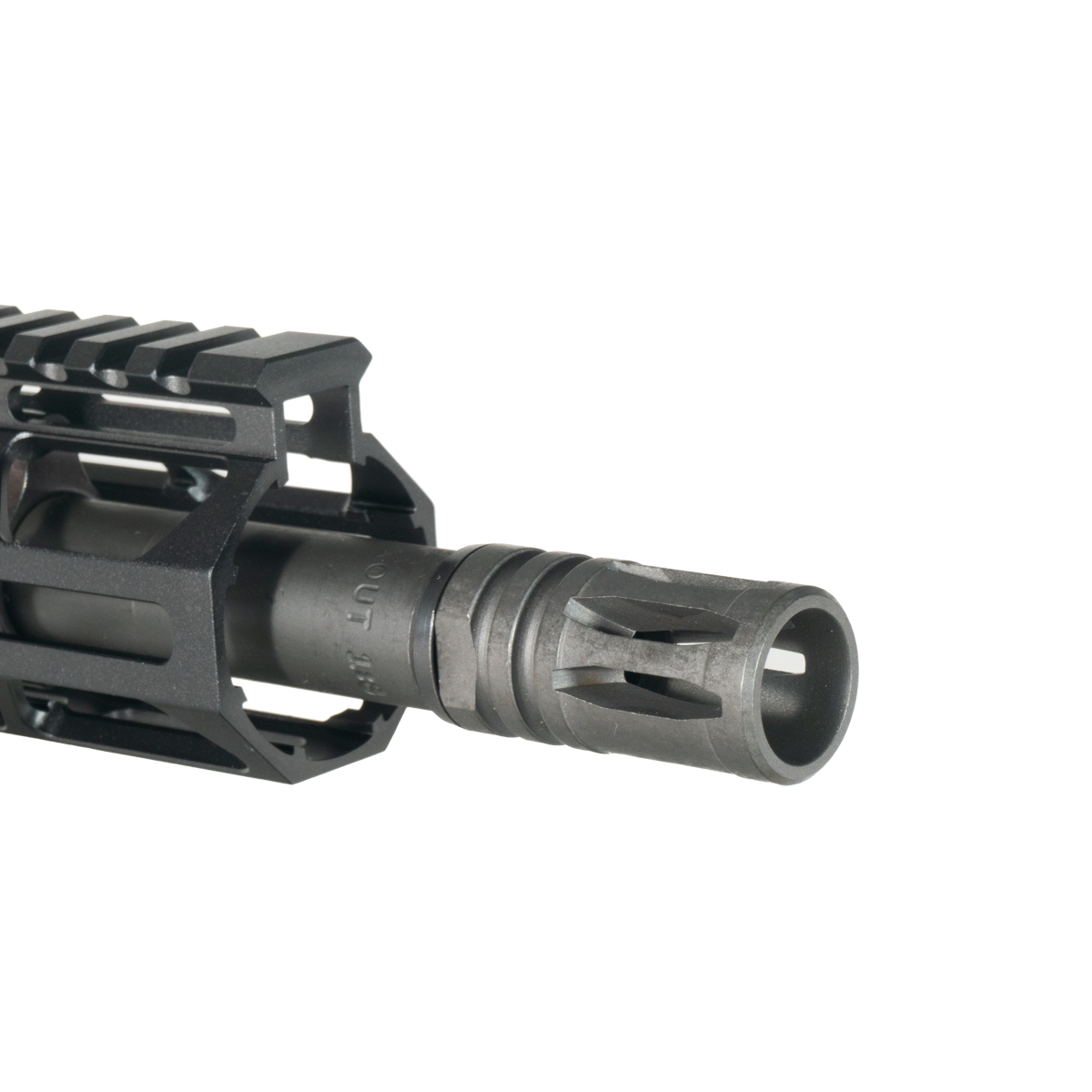 The barrel features 5/8x24 threads, a standard thread pitch for 300 BLK muzzle devices. The included GI birdcage flash hider can be replaced with other compatible devices including suppressors.
