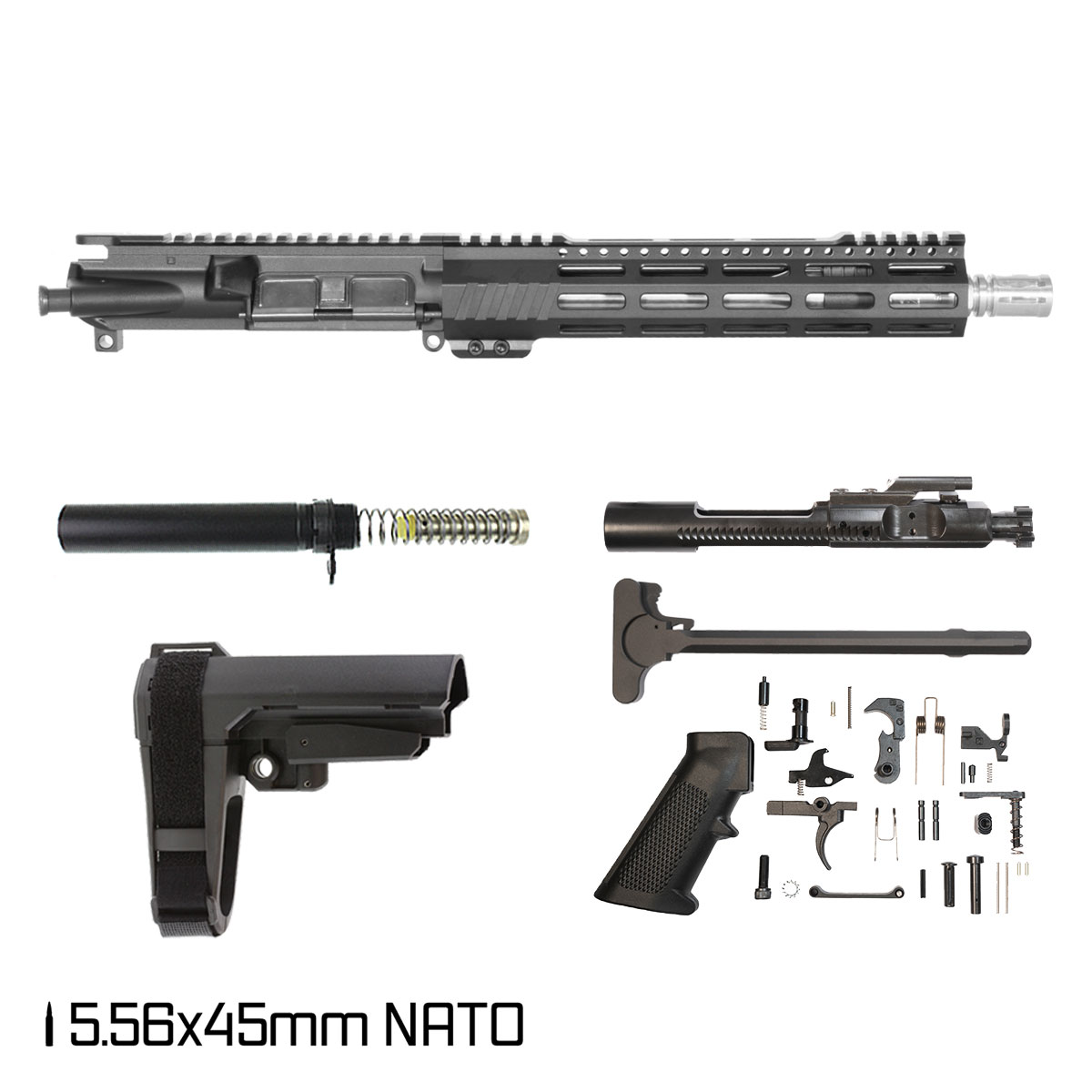 This Aegis Lightweight 10.5-inch AR-15 5.56 NATO Pistol Full Build Kit from Davidson Defense features a robust configuration ideal for firearms enthusiasts. It includes a 10.5-inch barrel made from 416R stainless steel with a polished finish, providing durability and performance. The barrel has a government profile with a 1:7 twist rate and is accompanied by a carbine gas system. This kit features a stripped upper receiver crafted from 7075 T6 aluminum with anodized finish and M4 feed ramps. The M-Lok handguard is made from 6061-T6 aluminum in black, ensuring versatile attachment points for accessories. The Premium AR-15 5.56 complete bolt carrier group is constructed from 9310 alloy steel and finished in nitride. The SBA3 Brace offers an adjustable stabilizing feature for better handling.