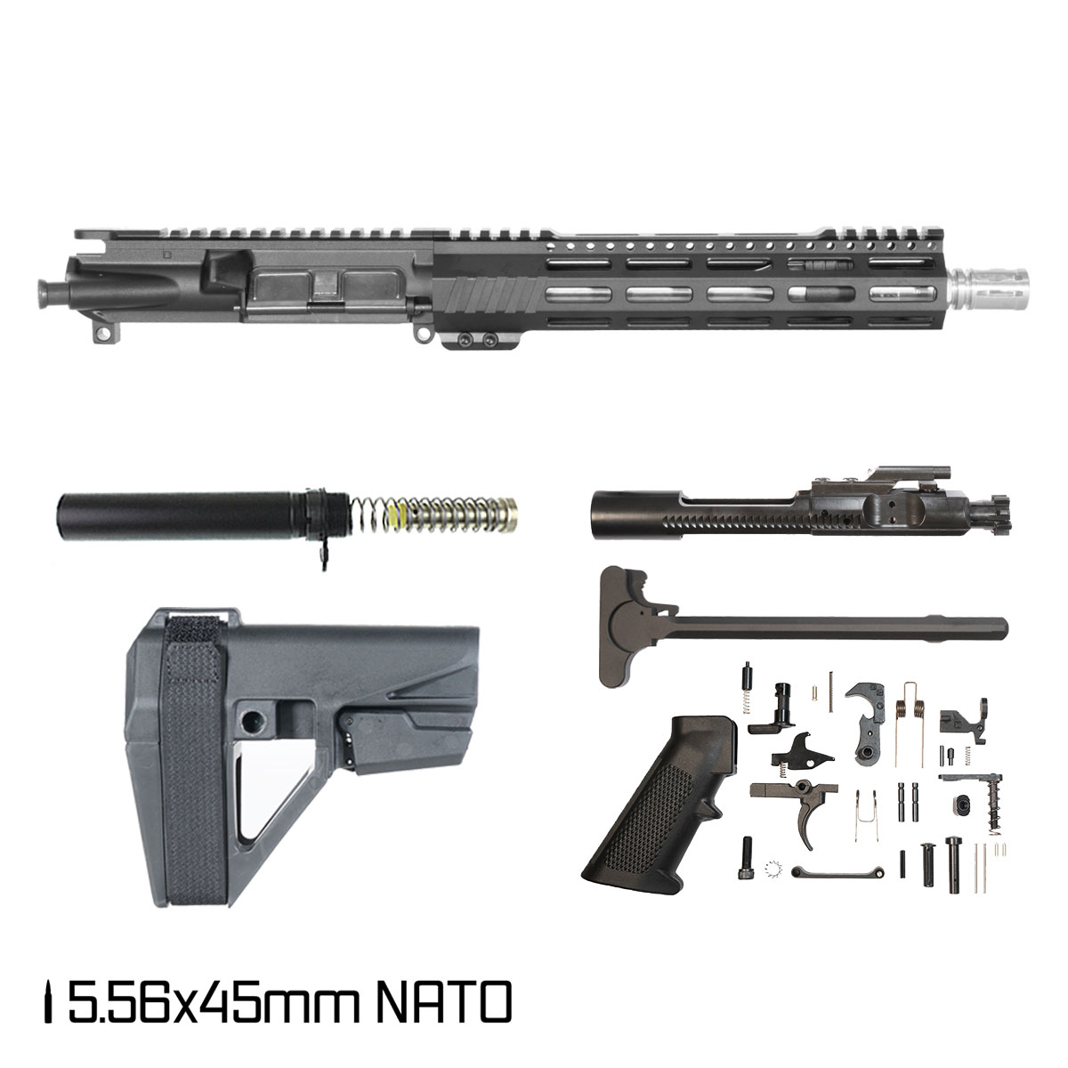 This Aegis Lightweight 10.5-inch AR-15 5.56 NATO Pistol Full Build Kit from Davidson Defense offers a robust platform for firearm enthusiasts seeking performance and reliability. This kit features a durable SBA5 Brace, ensuring stability and accuracy during use. It includes a 10.5-inch barrel made of 416R stainless steel, with a polished finish and a government profile, showcasing a 1:7 twist rate suited for 5.56x45mm NATO ammunition. Key components comprise a 7075 T6 aluminum upper receiver, an M-Lok compatible handguard constructed from 6061-T6 aluminum finished in black, and a mil-spec charging handle. The kit also includes a complete bolt carrier group made from 9310 alloy steel with a nitride finish. A stainless steel bird cage GI type flash hider serves as the muzzle device. With a mil-spec buffer tube kit and a 3 oz. buffer weight, this ready-to-assemble kit guarantees reliable performance in various settings.