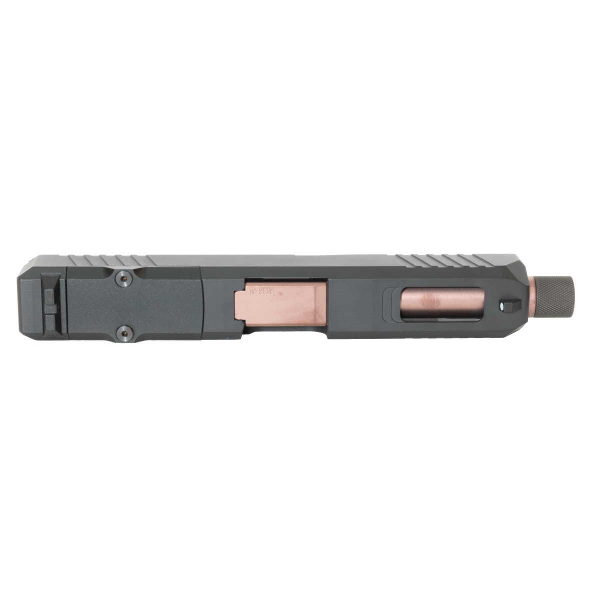 The Wayfinder Threaded Copper PVD Barrel G19 Gen 1-3 Compatible Complete Slide Kit from DTT Stiffler MFG is engineered for precision and durability. This complete slide kit is suitable for Glock 19 models from Gen 1 through Gen 3 and features a striking black finish with Graphite Black Cerakote. The kit includes an RMR optic cut, allowing for seamless integration with RMR optics, and comes with a cover plate for added versatility. The highlighted component of this kit is the Glock 19 Compatible Threaded Barrel, crafted from 416R stainless steel and finished with a copper PVD coating.