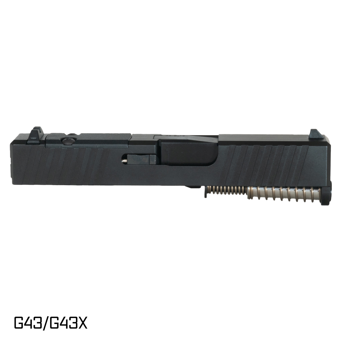 The low-profile front and rear sight assemblies ensure quick target acquisition without hindering the slide's streamlined design. The precision-fit performance grade steel barrel, finished in black nitride, boasts a 1:10 twist rate, optimizing projectile stability for 9MM (9x19) calibers. This complete slide kit is a reliable choice for gunsmiths looking to upgrade or customize their Glock G43 with high-quality components tailored for performance and compatibility.