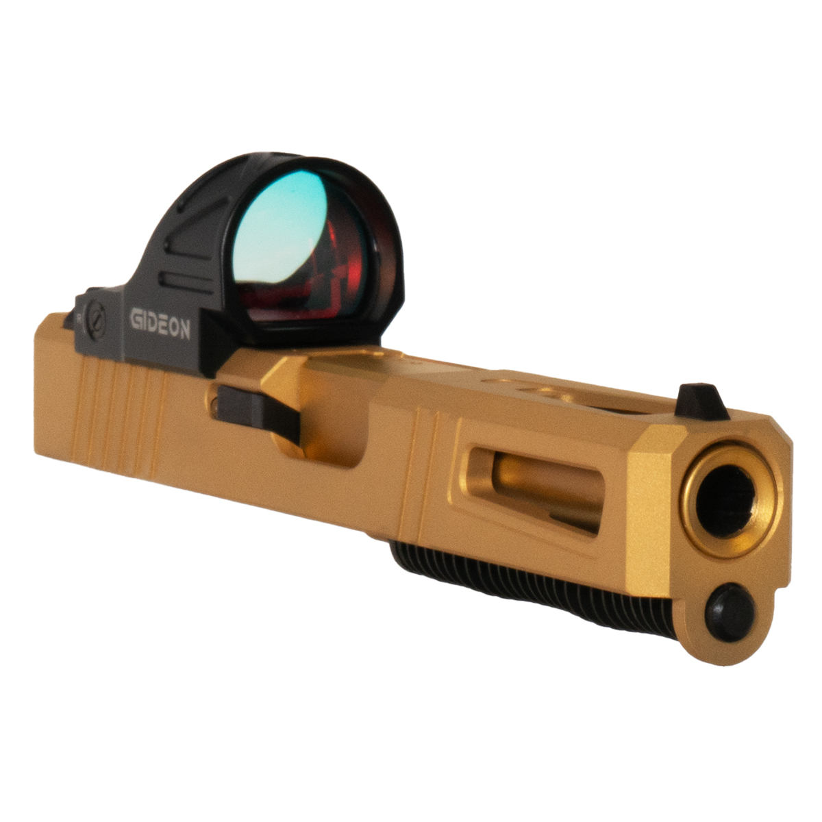 The slide is made from 17-4 stainless steel, providing strength and longevity. Complementing the slide is the Gideon Optics Omega single red dot sight, which is SRO-compatible and features a shake-to-awake activation for effortless operation. The sight provides precise adjustments at 1-MOA per click and includes a tall profile fiber optic sight for improved visibility. This complete slide kit is engineered for precision shooting and consistent performance with every pull of the trigger.