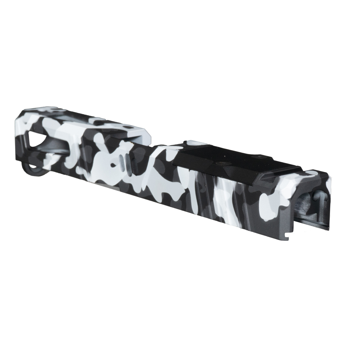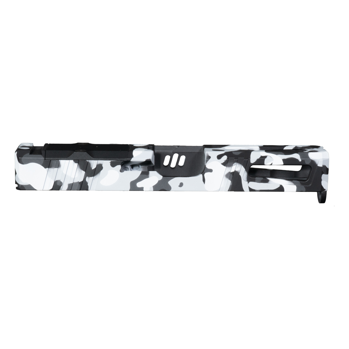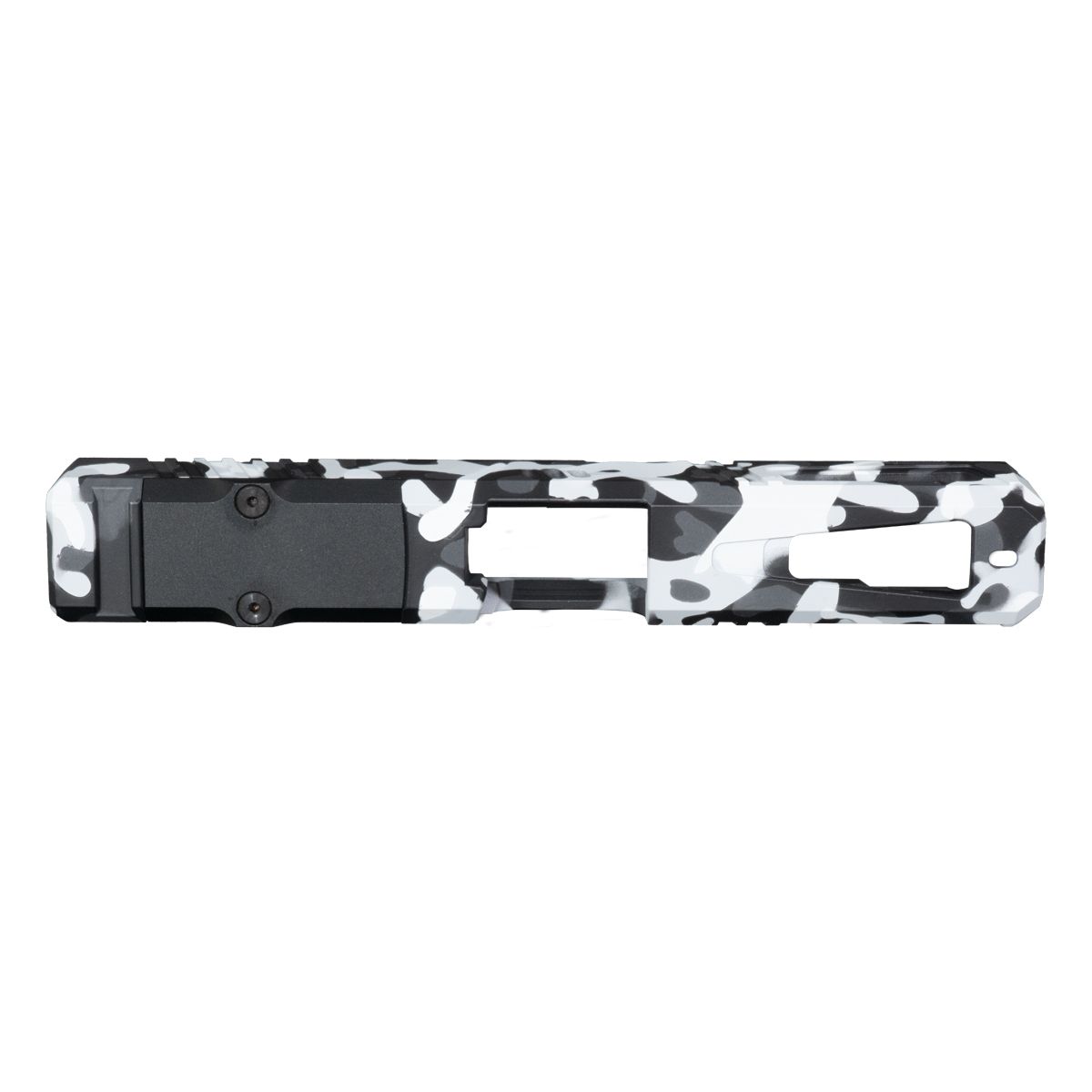 The Stiffler MFG G19 Compatible Viper Slide is a robust upgrade for your handgun, specifically engineered for the Glock 19 platform. This slide sports a winter camo Cerakote finish that not only protects against wear but also adds a unique aesthetic appeal. The RMR cut allows for seamless integration of popular optics, providing shooters with quick target acquisition and enhanced accuracy.