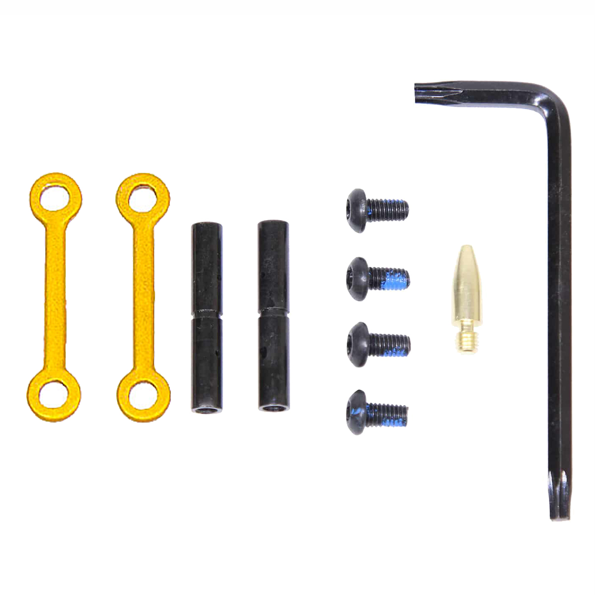 Finished in a striking anodized gold, it not only looks great but also adds a layer of protection against wear and corrosion. Compatible with AR-15 and AR 9mm platforms, this set replaces standard pins and installs easily with the included Allen key. Proudly made in the USA, it's a dependable upgrade for gunsmiths and AR enthusiasts who want performance they can count on—and looks to match.
