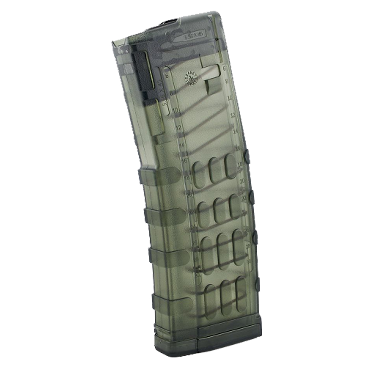 The KCI USA 30-round polycarbonate magazine uses a polycarbonate body with a transparent opaque finish and a textured exterior surface. Stainless steel feed lips and a 17-7 stainless steel spring make up the steel internal components. The anti-tilt follower and dual-sided round count indicators round out the feature set of this magazine.