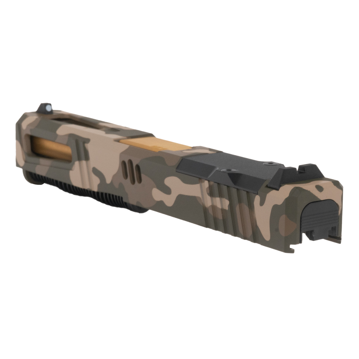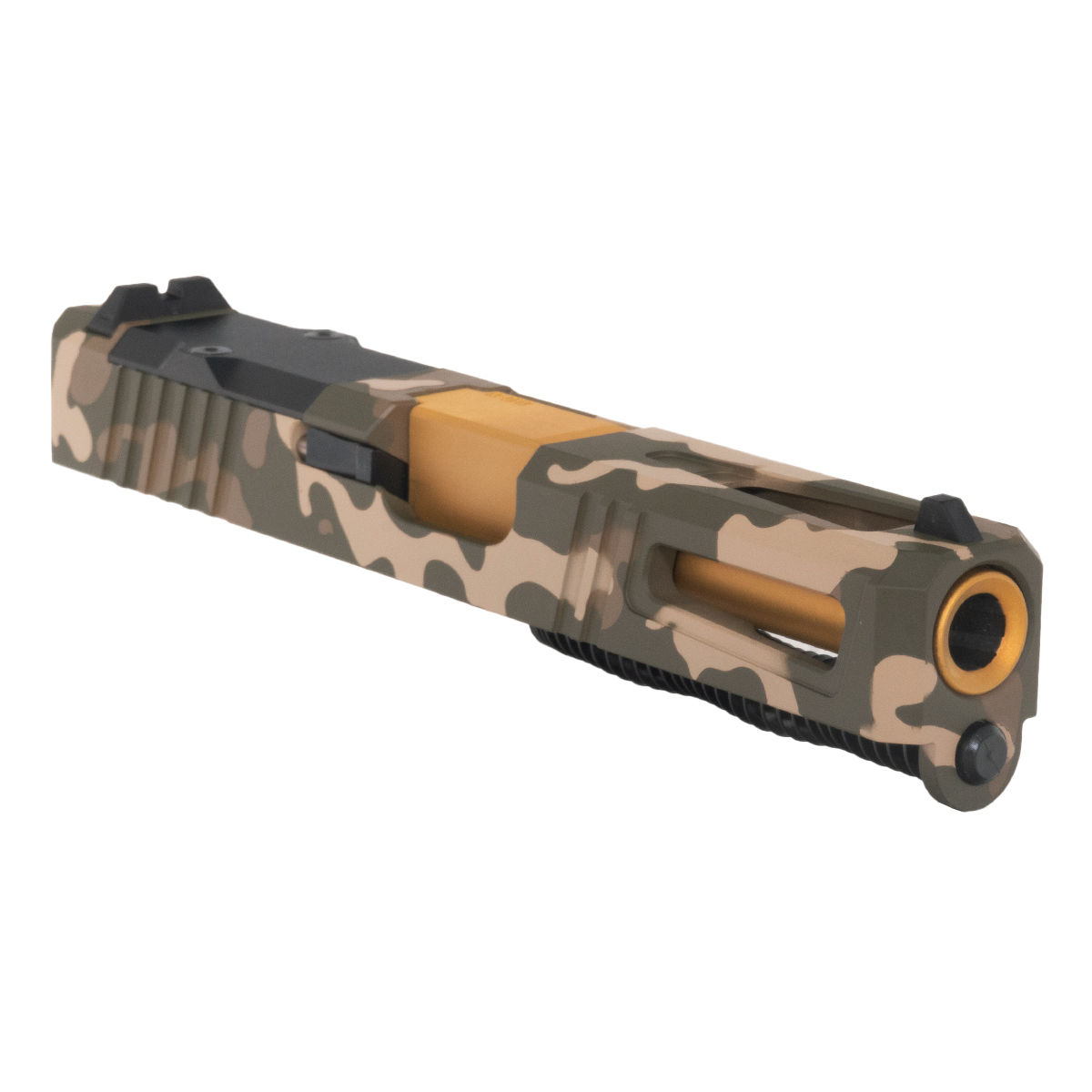 The Lionheart Ported Gold TiN Barrel G19 Gen 1-3 Compatible 9MM OD Camo RMR Complete Slide Kit from DTT Stiffler MFG delivers precision and reliability for your Glock configuration. This complete slide kit features a compatible Viper slide, designed specifically for G19 Gen 1-3 models, ensuring seamless integration and performance. The slide is finished in an OD Camo Cerakote, providing an enduring and rugged look.