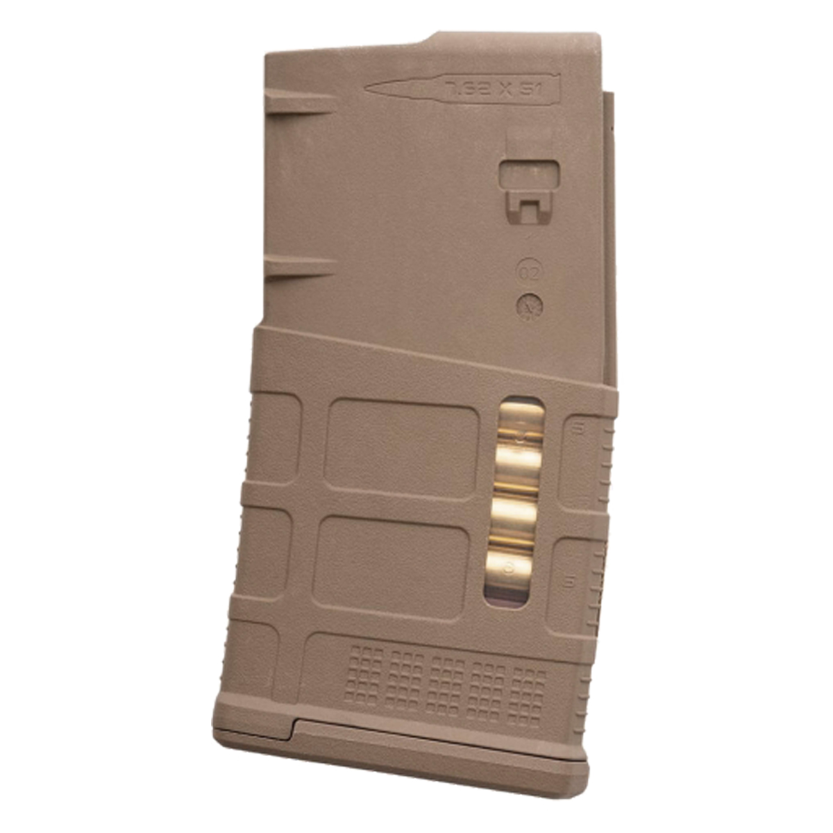 The Magpul FDE 20RD .308 MAG, PMAG LR/SR G-M3 with Window is a reliable and durable magazine designed specifically for .308 Winchester and 7.62×51mm cartridges. With a capacity of 20 rounds, it is compatible with AR-10, M110, SR25, and other similar platforms, making it an asset for gunsmiths who value performance and freedom. Constructed from high-quality materials, this magazine weighs 5.8 oz and measures 6.5 inches in length.