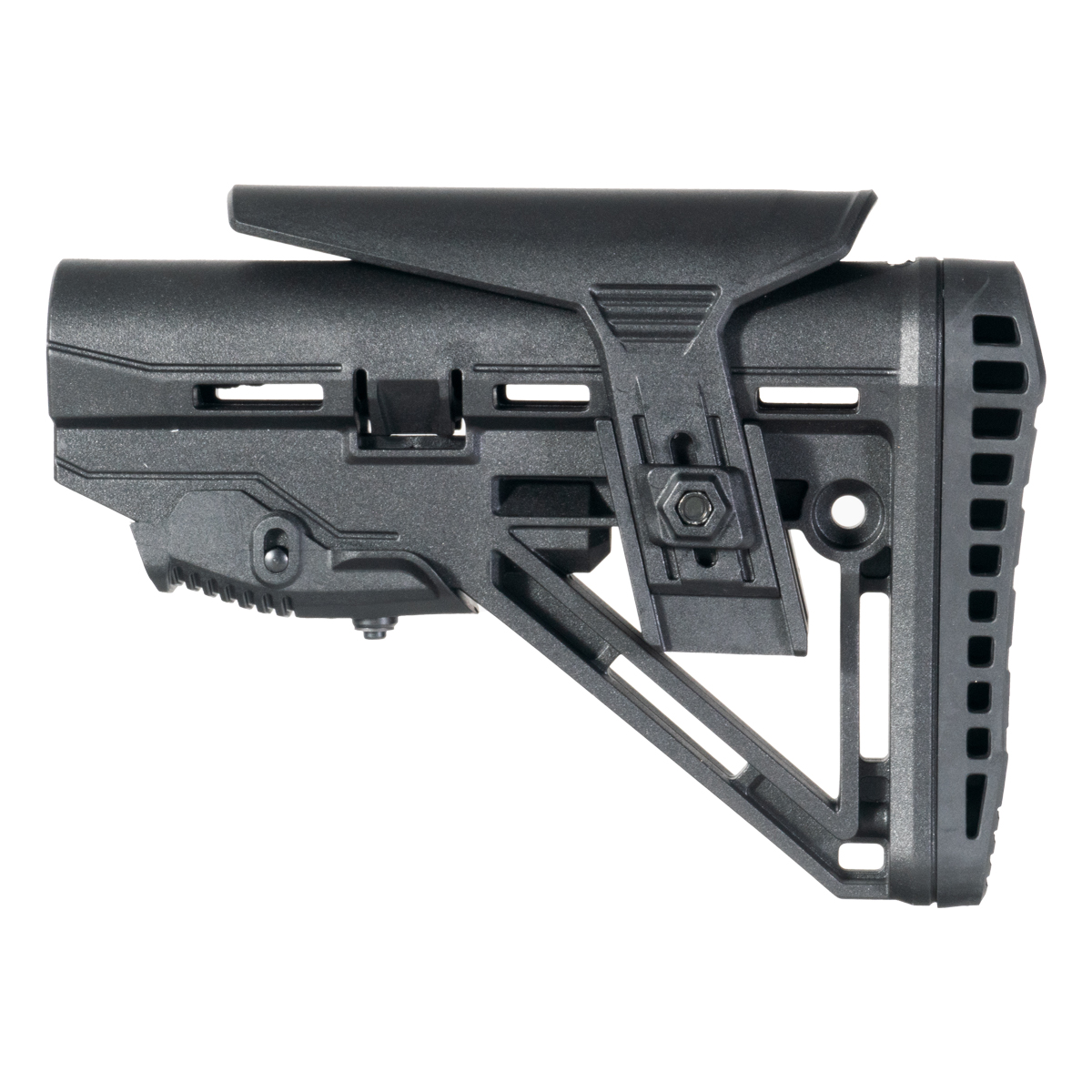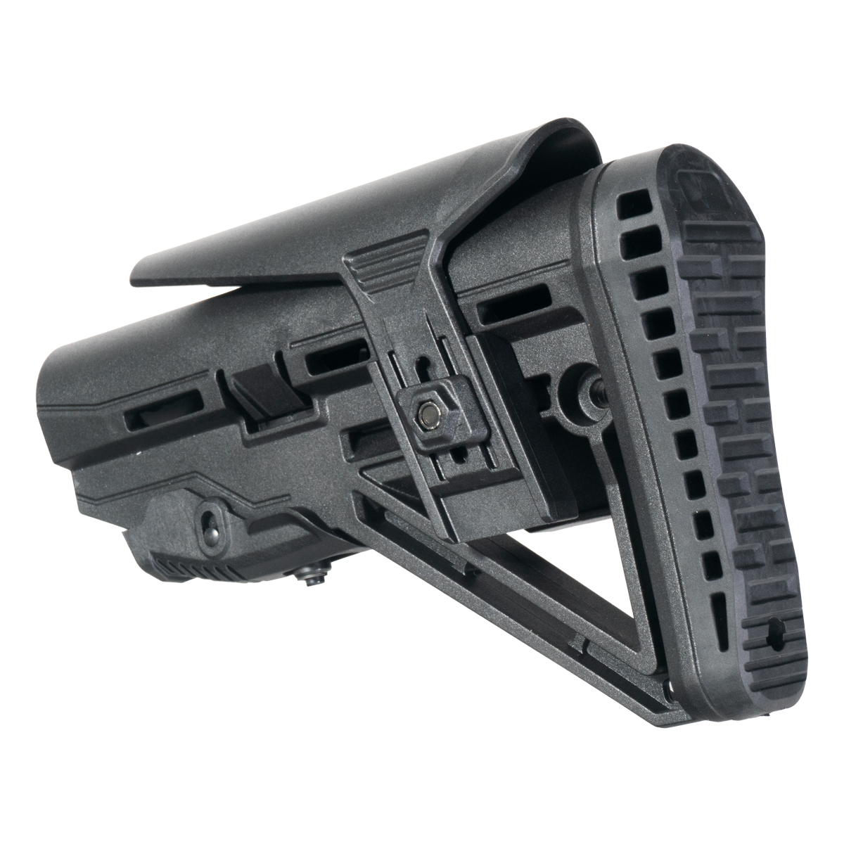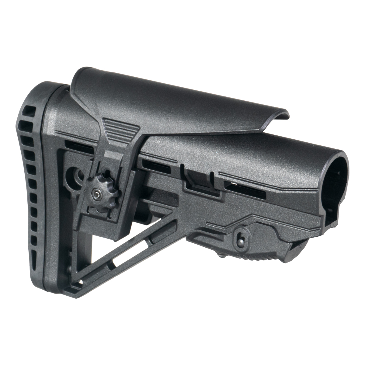Polymer delivers durability while keeping weight manageable. The material resists impact damage, environmental exposure, and temperature extremes better than basic plastic. Polymer construction also dampens vibration and provides a solid lockup on the buffer tube without rattling.