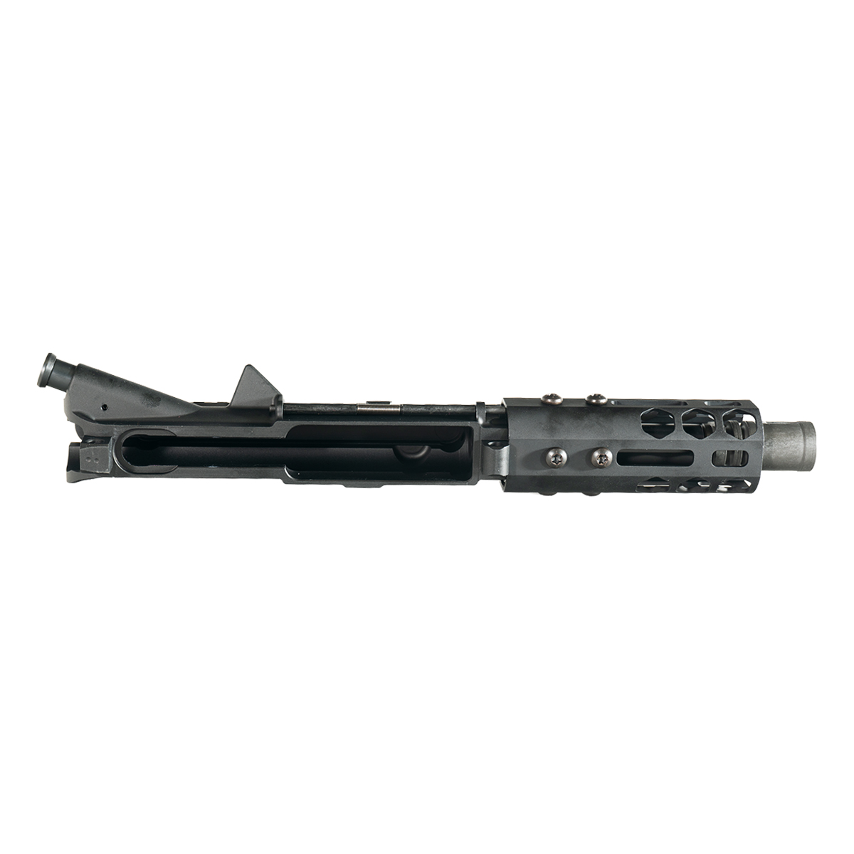The 4.5-inch barrel is chambered in 9mm and constructed from 4150 CrMoV steel with a medium profile and a 1:10 twist rate. The nitride finish covers the full barrel surface for corrosion and wear resistance. The muzzle is threaded 1/2x36 and includes a 9mm A2 birdcage flash hider. The 4-inch black 6061-T6 aluminum Air Lite Series honeycomb M-Lok freefloat handguard provides M-Lok slot access along its length for accessory mounting. The AR-9 platform operates on blowback, with no gas system components in this configuration.