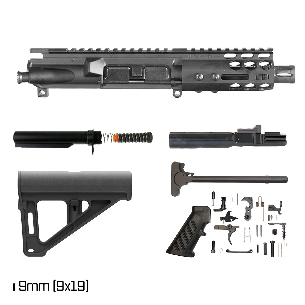 The upper receiver is machined from 7075-T6 aluminum with an anodized finish. The 9mm bolt carrier group is constructed from 8620 alloy steel with a nitride finish and is specific to the AR-9 platform. The included mil-spec AR-15 M4 charging handle meets mil-spec dimensional standards for use with the upper receiver included in this kit.