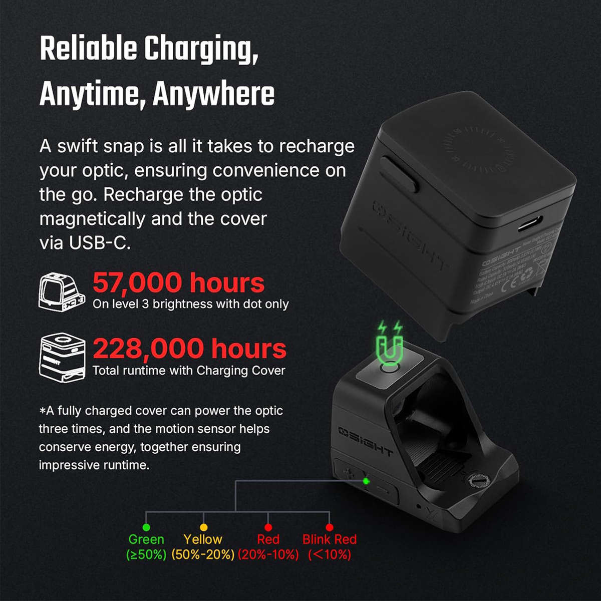 The built-in rechargeable battery eliminates disposable battery replacement and supports extended deployment. The magnetic charging cover attaches via USB-C and displays current battery level through a multi-color indicator. This cover can recharge the optic multiple times between its own charging cycles, providing backup power in the field. On Level 3 brightness with dot-only mode and charging cover support, the Osight X achieves up to 57,000 hours of runtime.