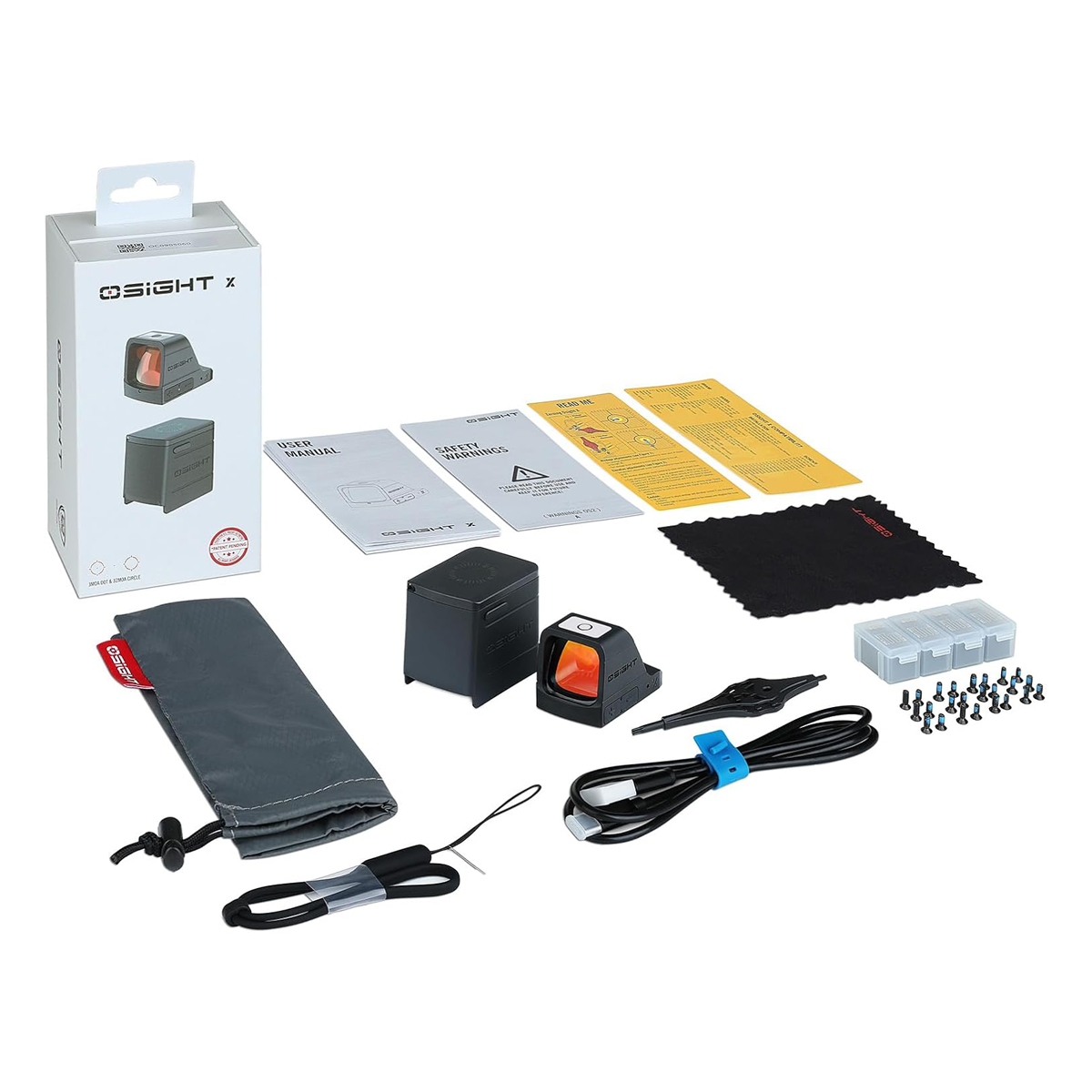 Constructed from OAL grade aluminum alloy and finished with black anodizing, the Osight X resists corrosion and surface wear. The optic is rated IPX6 for water resistance, protecting internal electronics from rain and splashing. The magnetic charging cover carries an IPX4 rating. The open reflex design prevents lens fogging and maintains a wide field of view with unlimited eye relief.