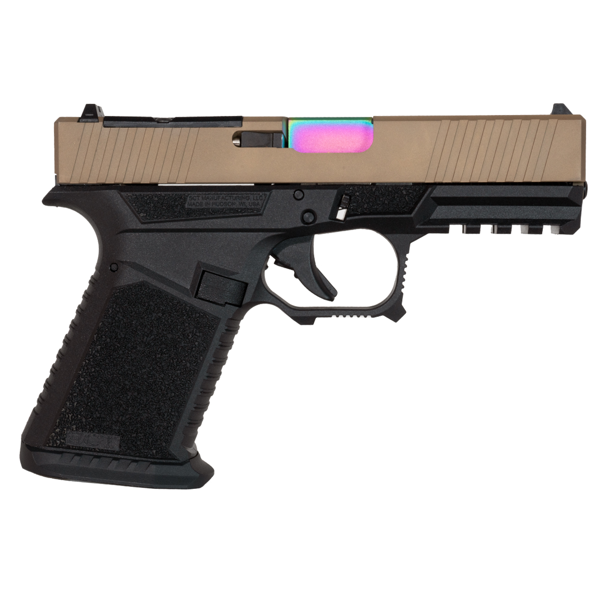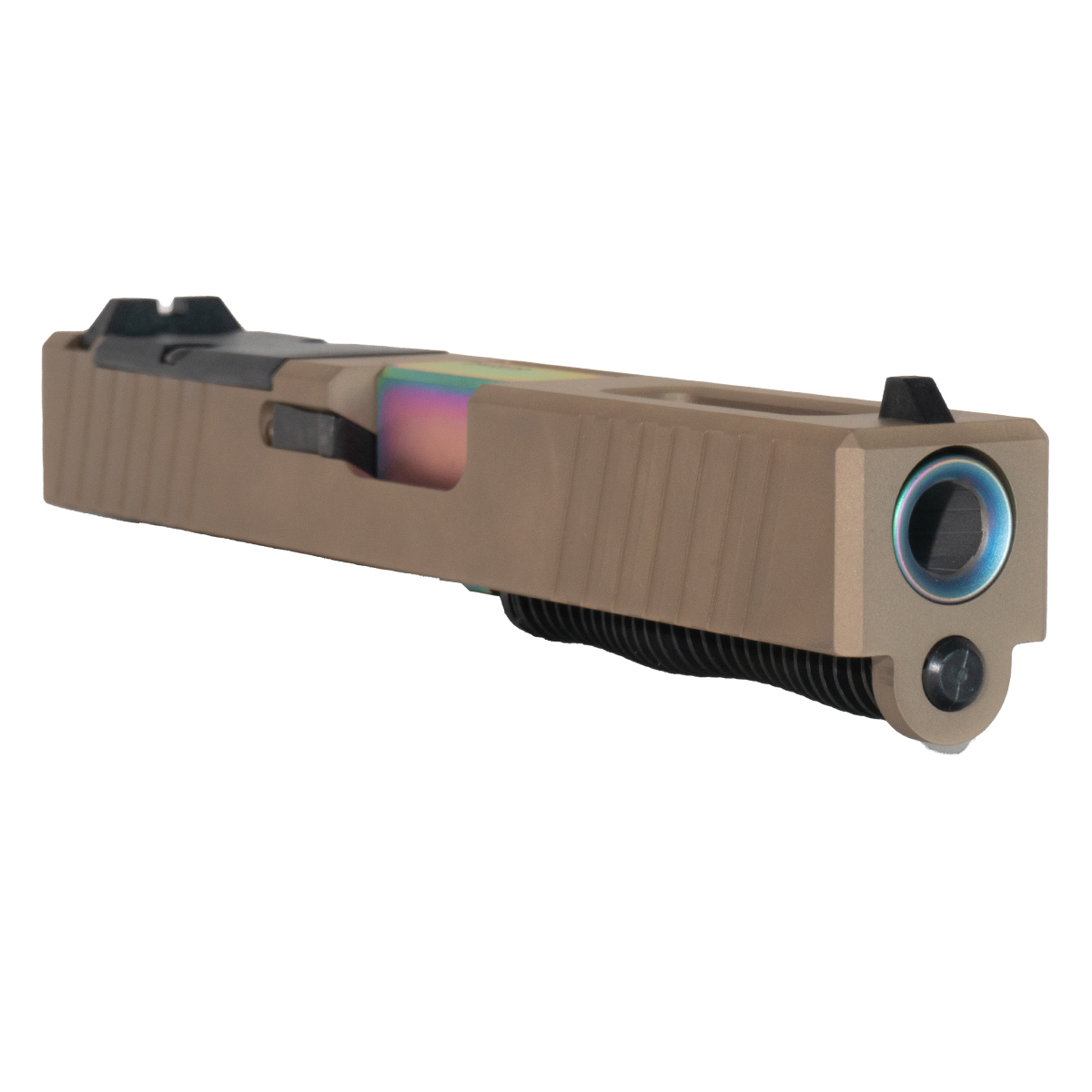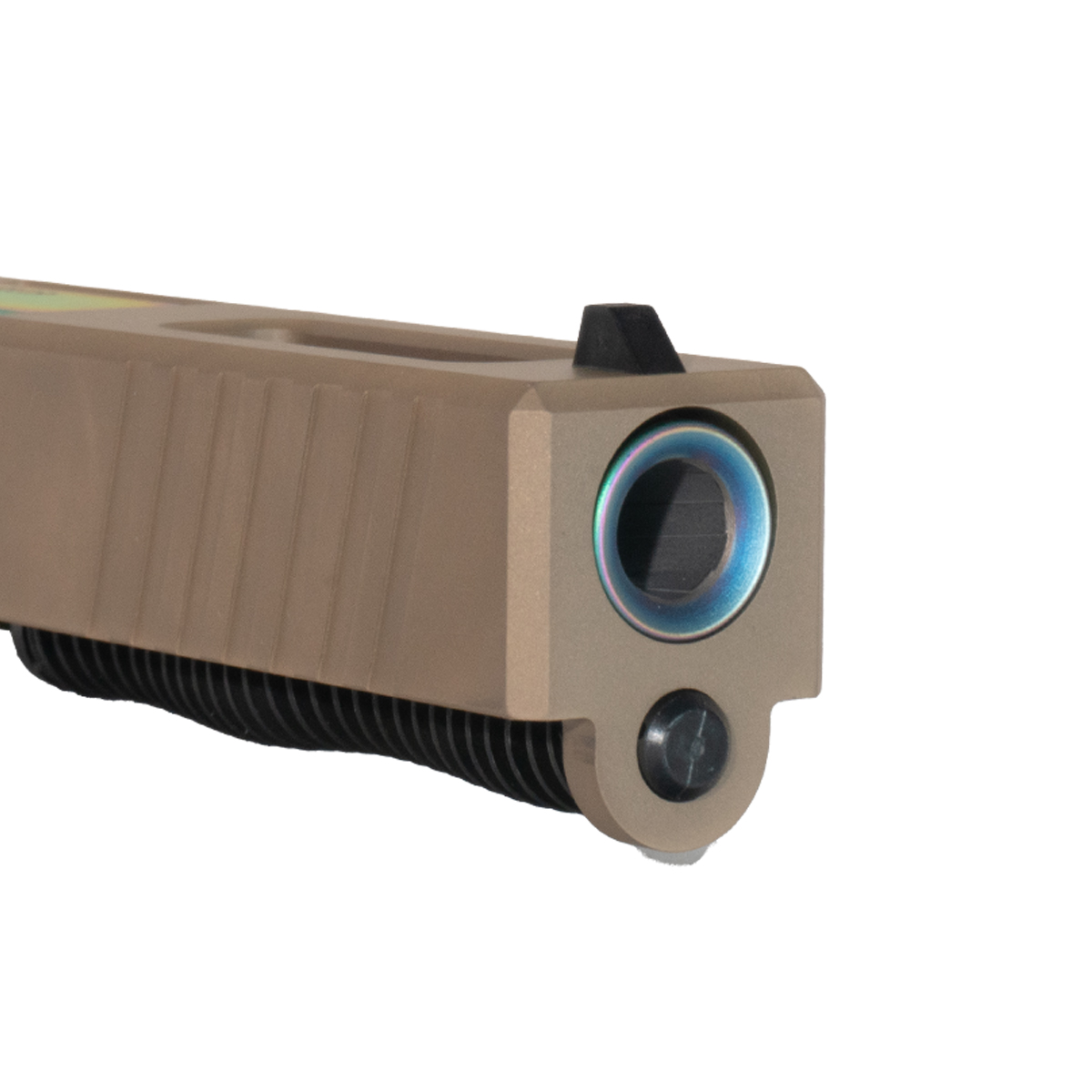 The Packless Rainbow PVD Barrel G19 Gen 1-3 Compatible 9MM FDE RMR Complete Slide Kit is engineered for Glock 19 enthusiasts seeking reliability and performance. This complete slide kit features a Glock 19-compatible flush cut crown barrel crafted from 416R stainless steel, finished with an eye-catching Rainbow PVD coating that provides both durability and aesthetic appeal. The slide is designed for generations 1 through 3 of the Glock 19, featuring serrations that facilitate handling and an RMR cut for optics compatibility.
