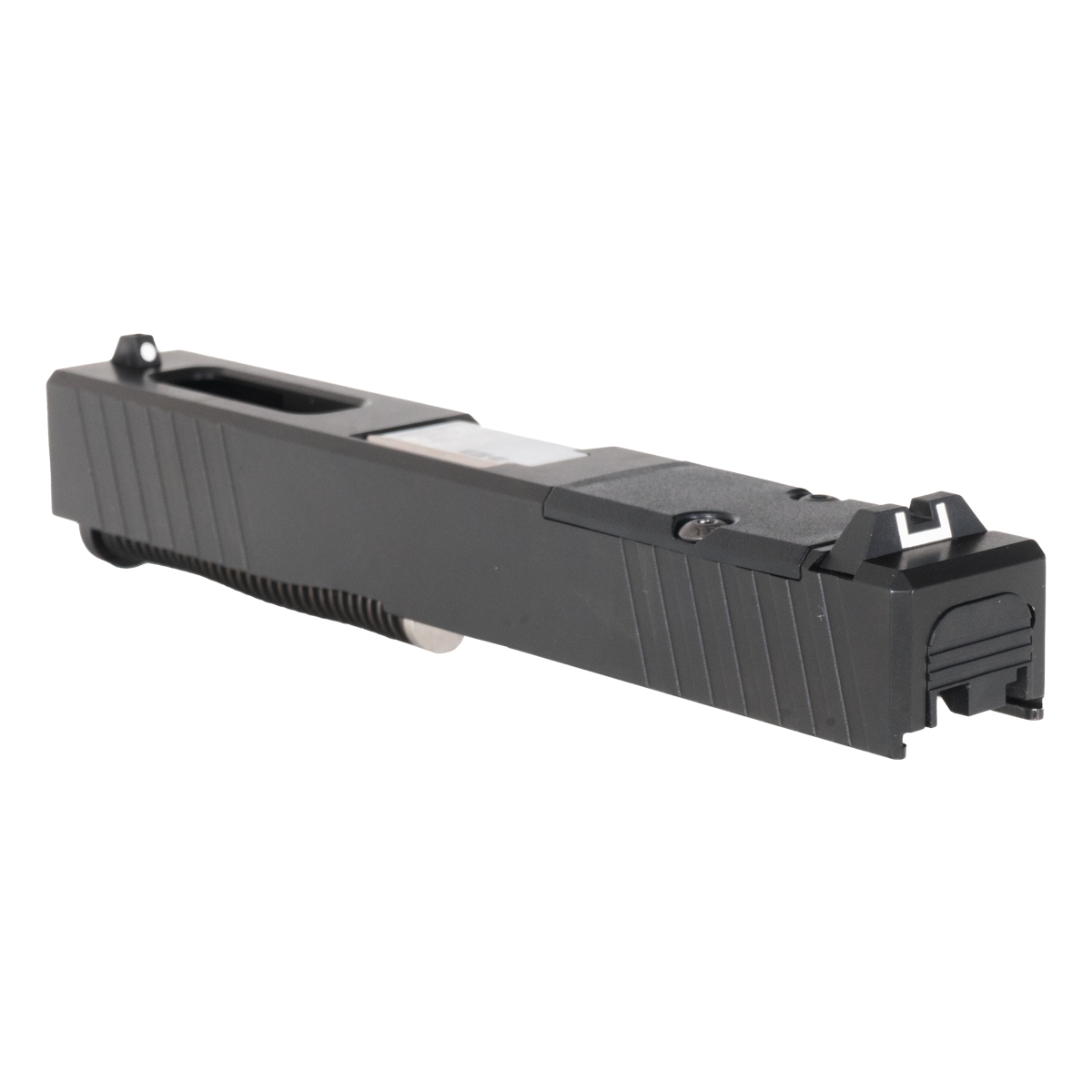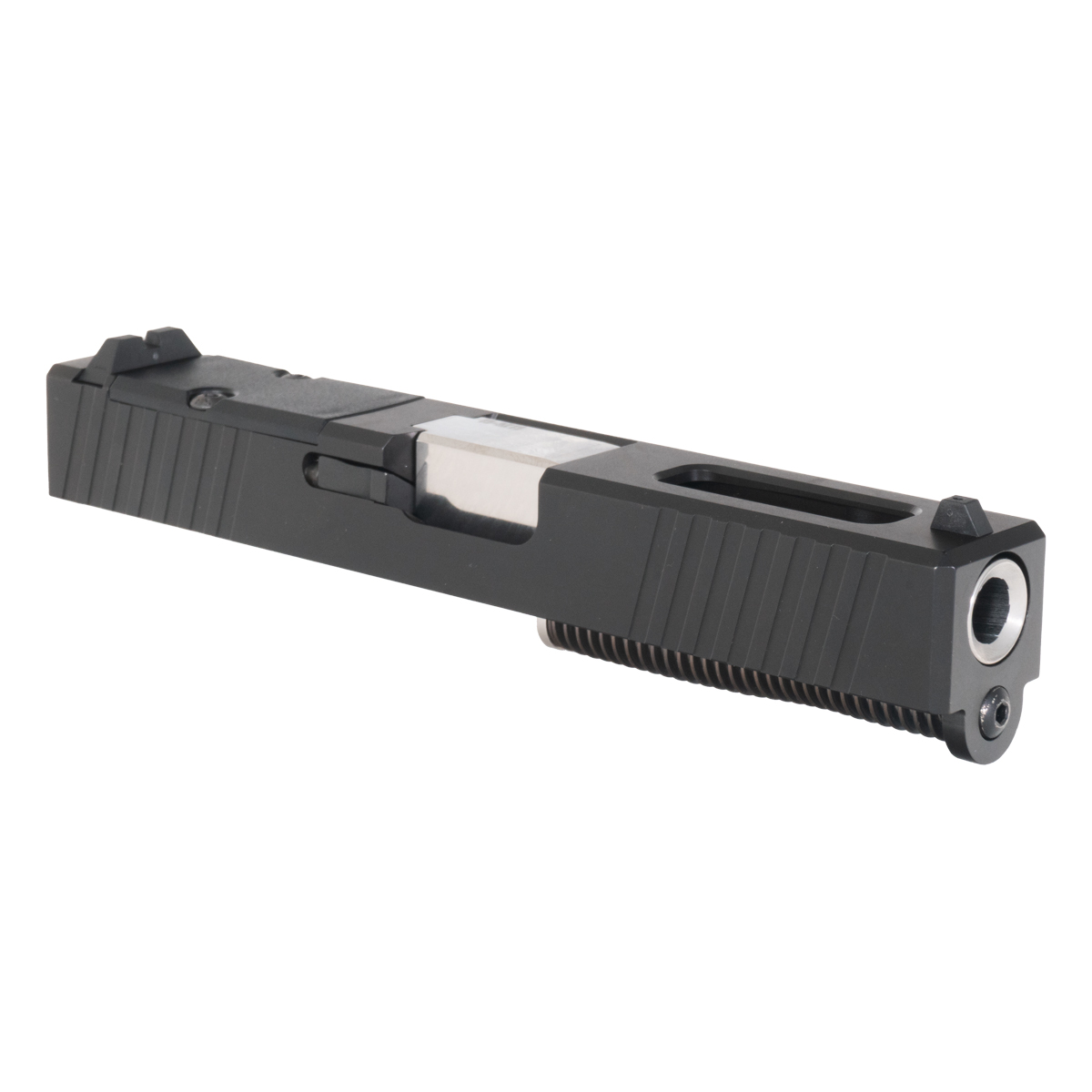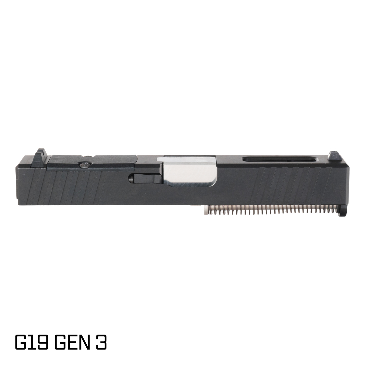 The Paladin Ported Polished Stainless Barrel G19 Gen 1-3 Compatible 9MM Black RMR Complete Slide Kit from Davidson Defense is engineered for compatibility with Glock G19 models from generations 1 through 3. This complete slide kit features a precision RMR cut with a cover plate, designed to accommodate a red dot sight for improved target acquisition. The slide includes forward window cuts optimized for a ported barrel, as well as front and rear serrations for enhanced manipulation.
