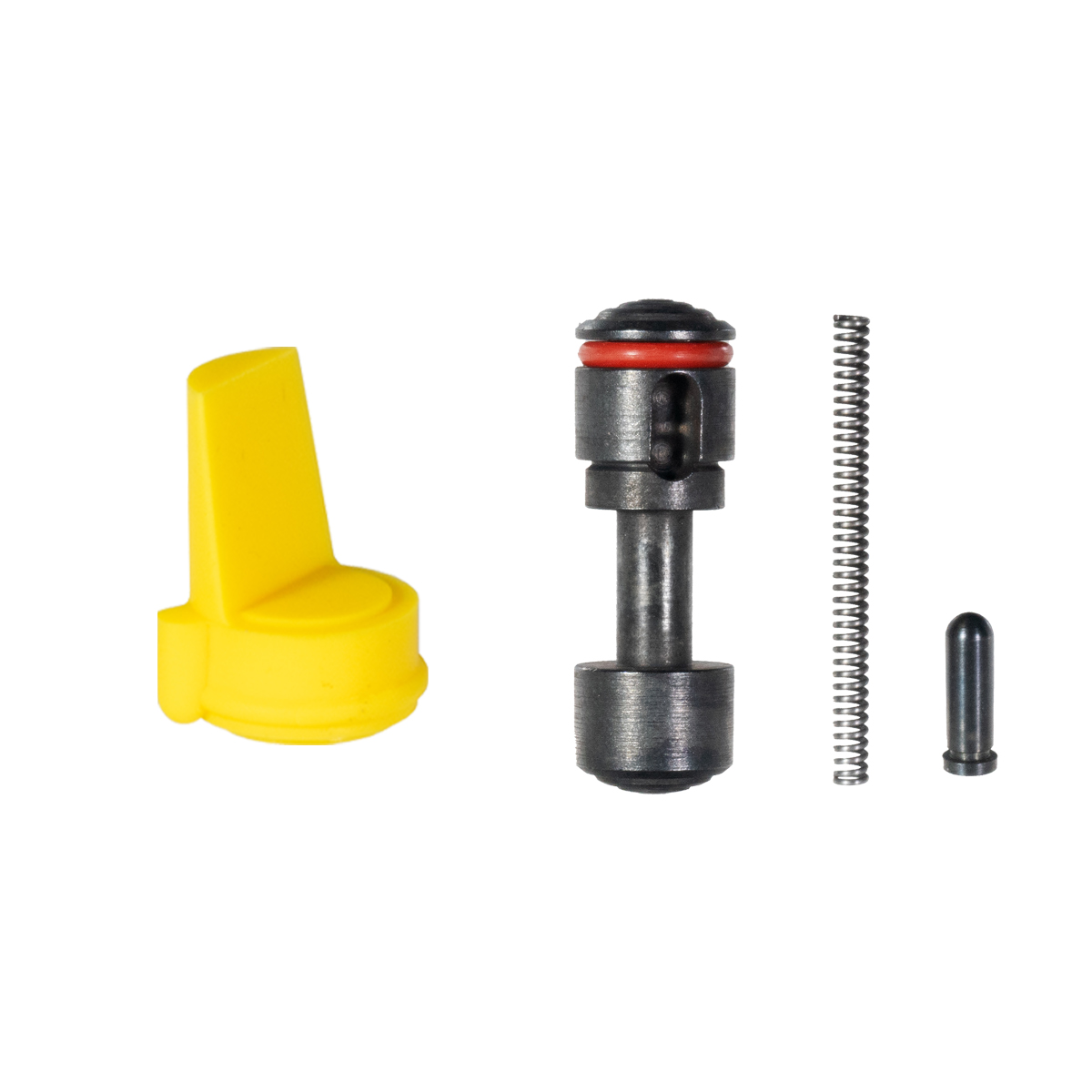 This lower parts upgrade kit includes a Presma carbon steel push button safety and a yellow rubber ACCU Wedge. The kit addresses safety function and receiver fit on AR-15, M16, and M4 platforms chambered in .223 and .308.