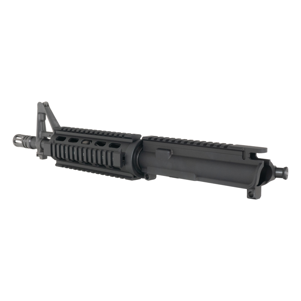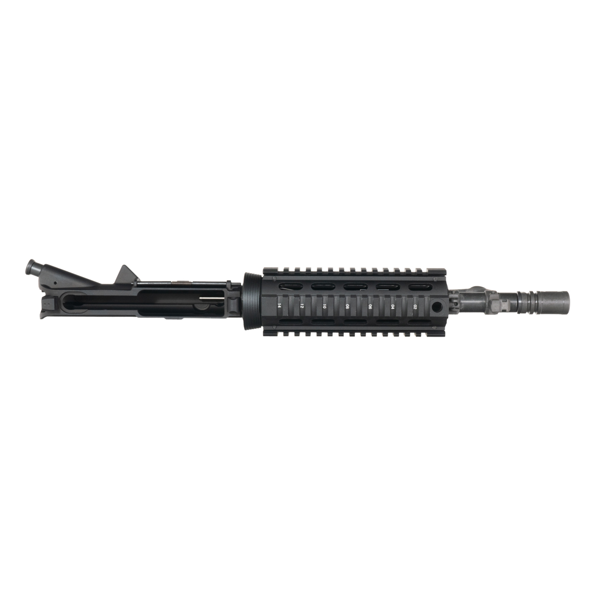 Although the gas system is pistol-length, the upper is fitted with a carbine-length quad-rail handguard to offer extended mounting real-estate and a familiar MK18 profile — the micro low-profile gas block (0.750) is mounted under that handguard (not using the front sight post as a gas block), paired with a stainless pistol-length gas tube for effective pressure management. A 5/8x24 muzzle thread pitch ensures compatibility with standard suppressors and accessories. Constructed from robust 7075-T6 aluminum, the anodized AR-15 upper receiver ensures lightweight strength, and the kit is completed with an AR-15 GI birdcage flash hider — an ideal package for gunsmiths building a reliable, freedom-centric firearm assembly.