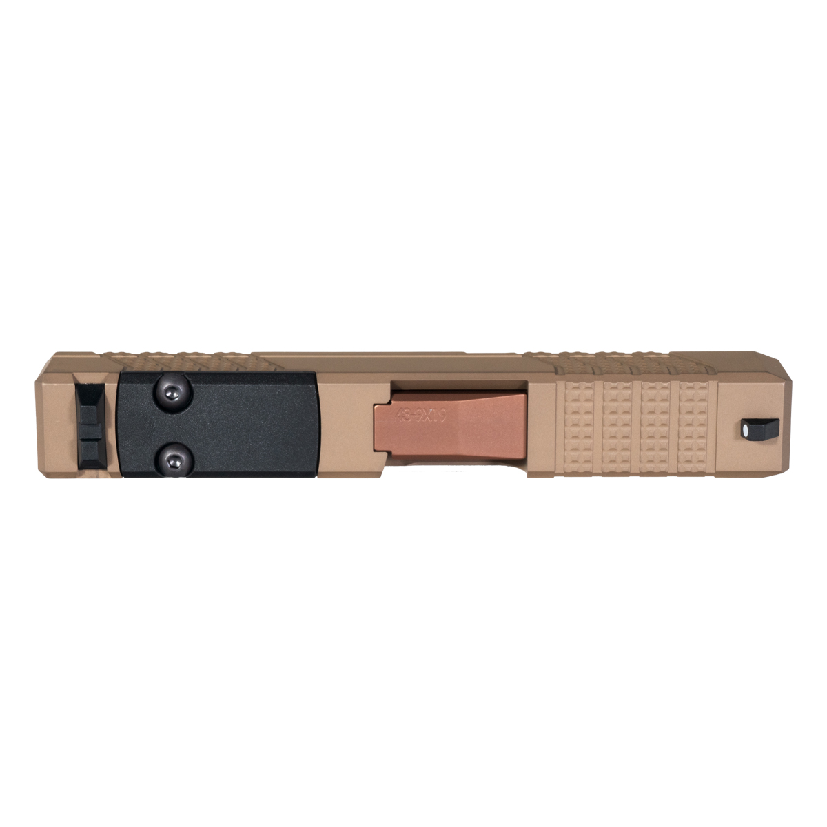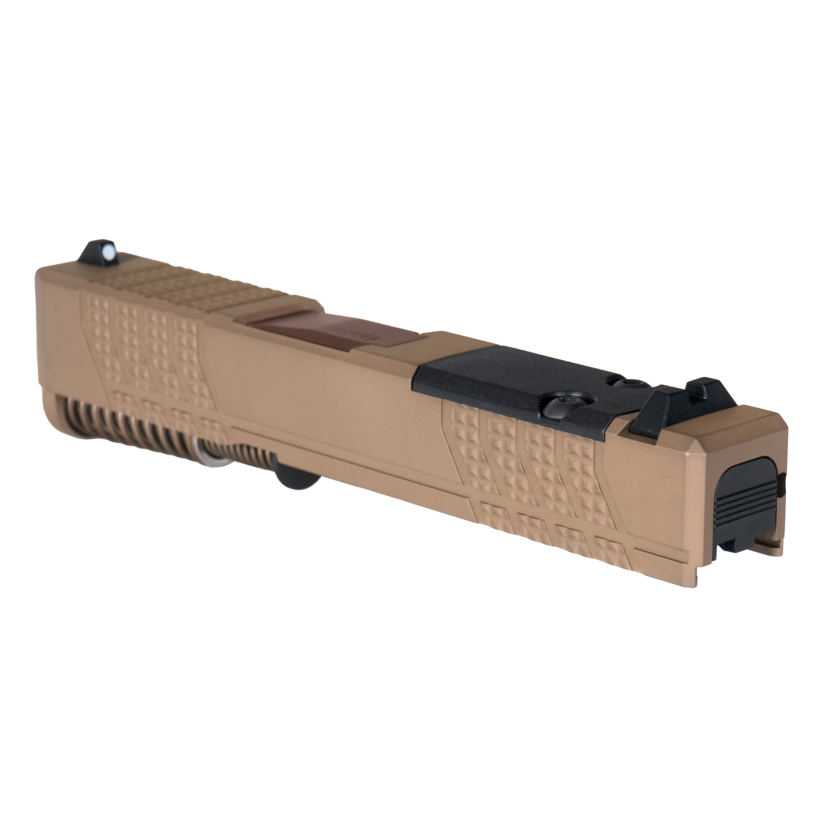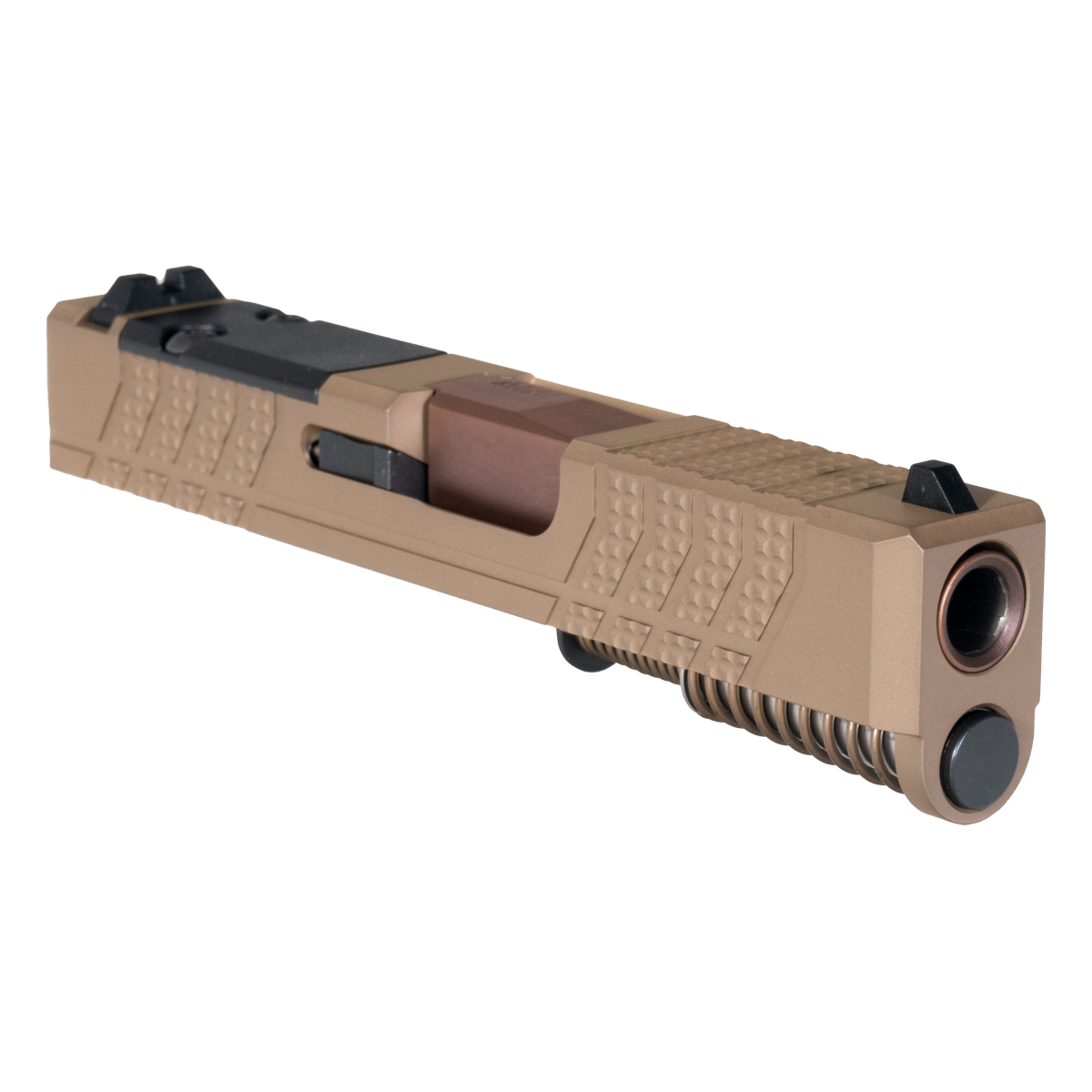 Davidson Defense Sentinel Crowned Copper PVD Barrel Complete Slide Kit delivers premium performance and distinctive styling for Glock 43 and 43X platforms. Constructed with precision-crafted 416R stainless steel barrel featuring crowned muzzle and 1:10 twist rate ensuring accuracy for 9MM (9x19), striking copper PVD barrel finish providing superior hardness and eye-catching appearance, Flat Dark Earth (FDE) PVD slide coating delivering durability and wear resistance, knurled serrations offering secure grip for reliable slide manipulation, RMS optics cut accommodating Reflex Mini Sight footprint for quick target acquisition, pre-installed cover plate, and low-profile front and rear sight assembly—perfect for Glock 43/43X custom builds, concealed carry upgrades with distinctive finishes, red dot installations, FDE build themes, and shooters seeking complete slide kits combining premium copper barrel aesthetics with proven performance complementing compact Glock platforms.