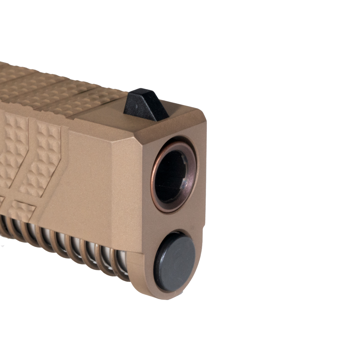 416R Stainless Steel Crowned Barrel with Copper PVD: The kit features precision-crafted 416R stainless steel barrel with crowned muzzle and 1:10 twist rate, ensuring precision performance for every shot and optimal bullet stabilization for 9MM projectiles. The target crown protects the rifling exit for maintained accuracy and consistent bullet release shot after shot. The striking copper Physical Vapor Deposition (PVD) finish provides superior hardness and corrosion resistance while creating eye-catching appearance that distinguishes this build from standard configurations. The copper PVD coating offers exceptional durability exceeding traditional finishes while reducing friction for smoother cycling and easier maintenance.