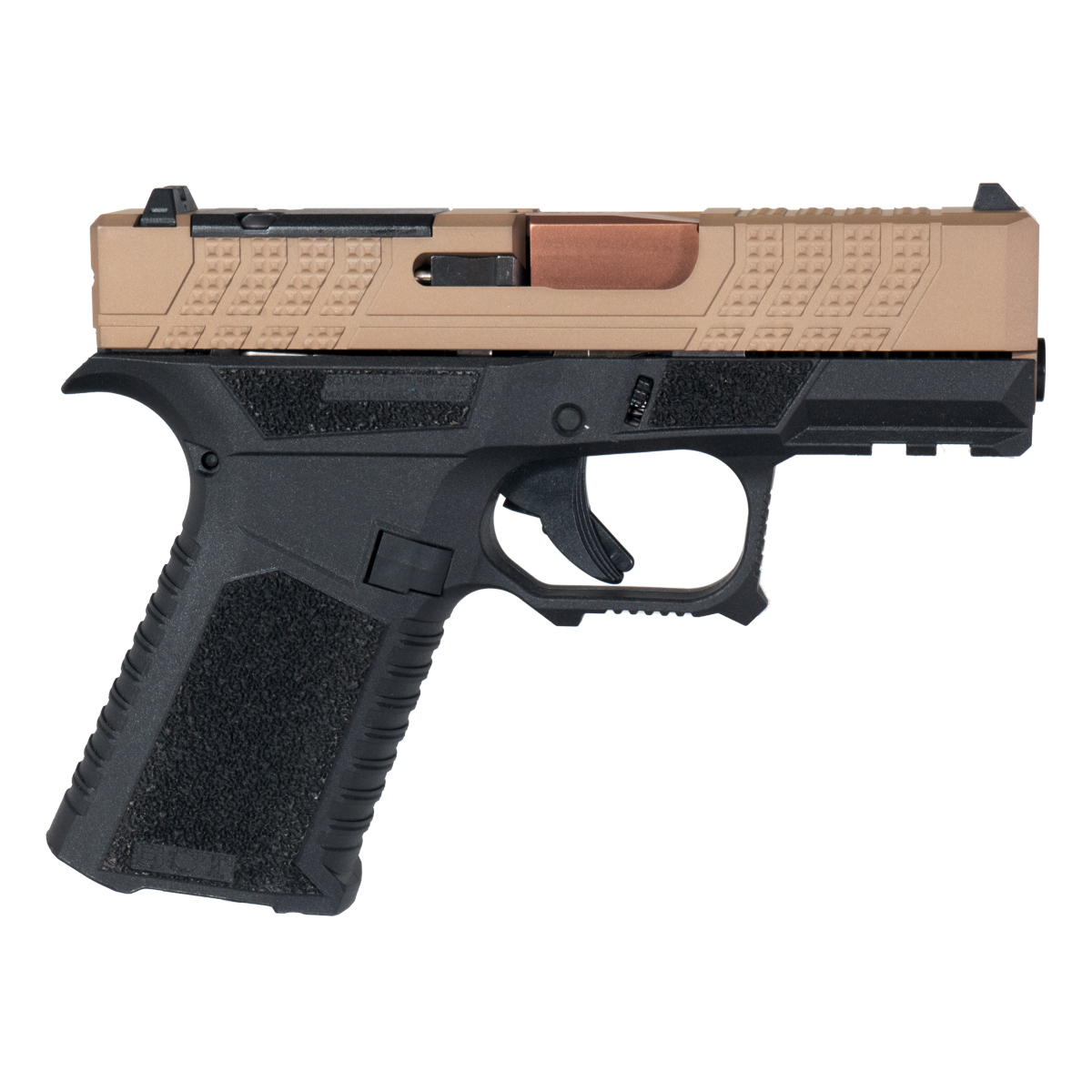 FDE PVD Slide with Knurled Serrations: The slide is finished in Flat Dark Earth (FDE) PVD coating that provides durability and resistance to wear for long-term concealed carry reliability. The FDE finish creates attractive two-tone contrast with the copper barrel for distinctive visual impact. The knurled serrations offer secure grip for reliable slide manipulation, press checks, and one-handed operation in adverse conditions or when wearing gloves. The aggressive texturing ensures confident handling during administrative tasks and malfunction clearing. The FDE PVD coating protects the slide from holster wear, environmental exposure, and rough handling while maintaining consistent appearance.