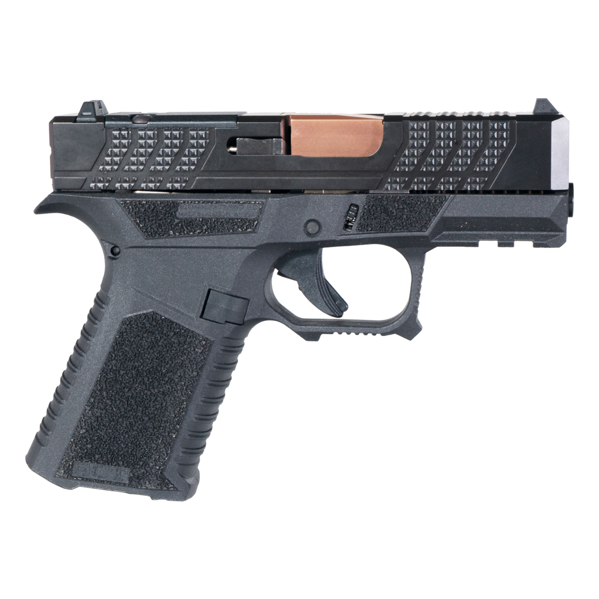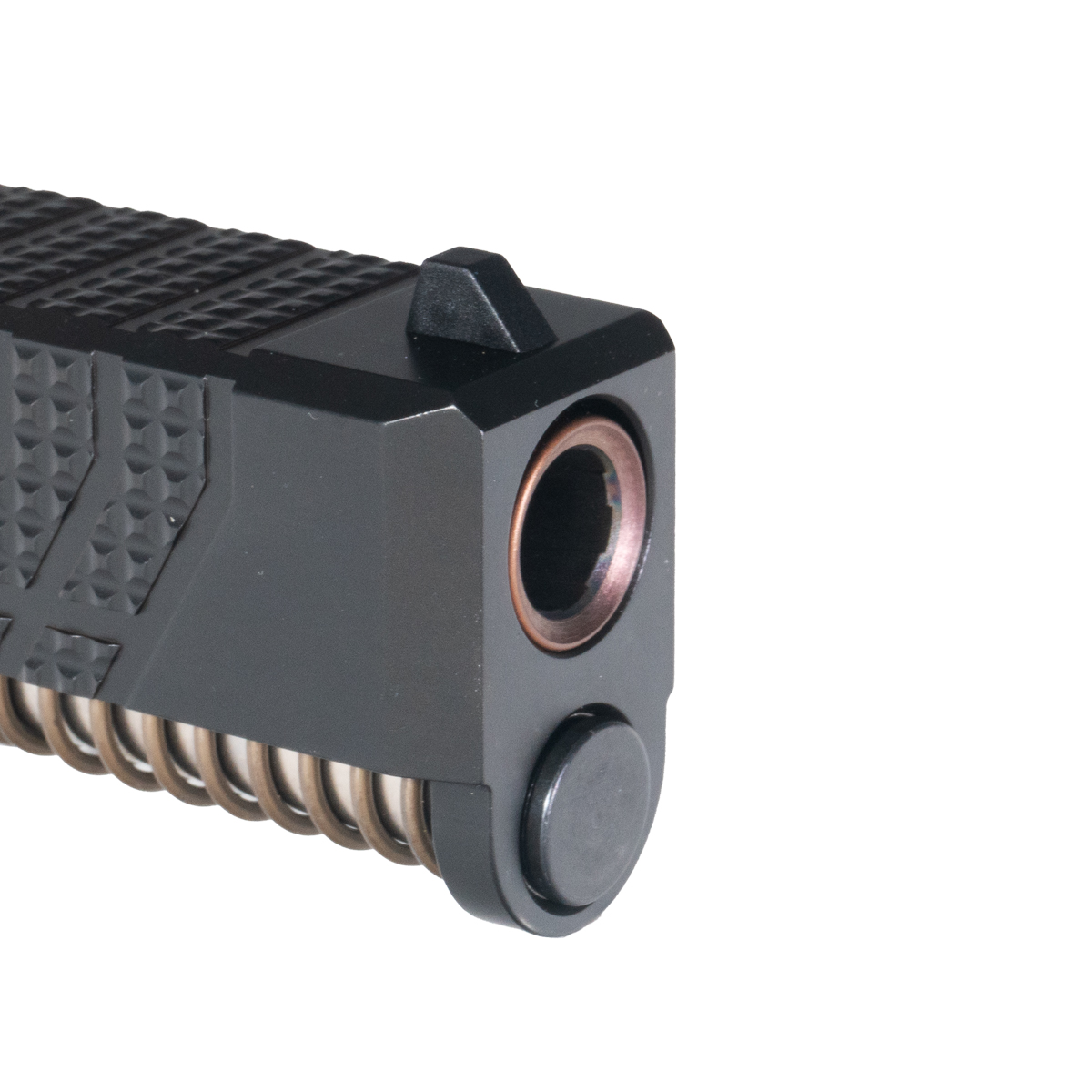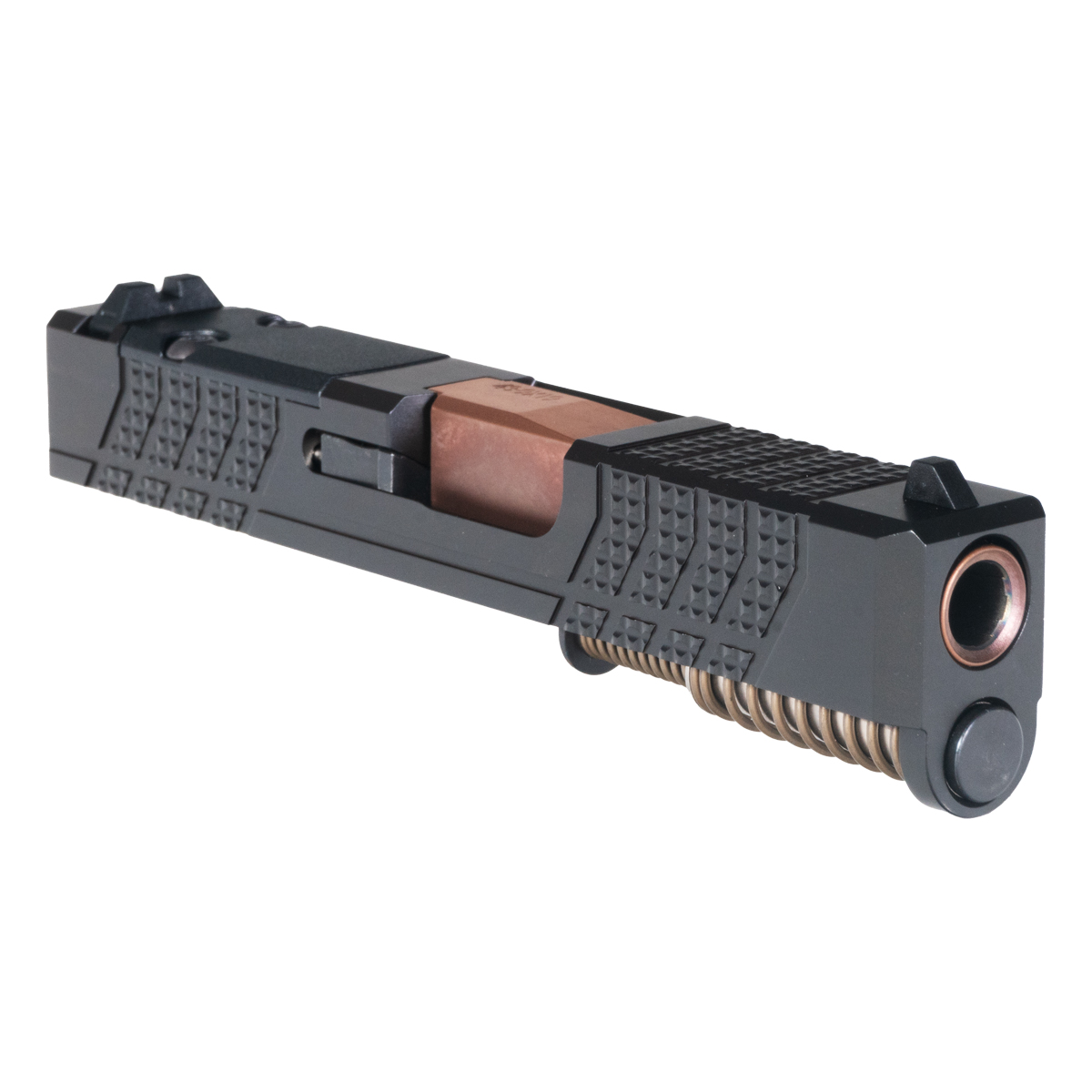 Black Nitride Slide with Knurled Serrations: The complete slide is constructed from 416R stainless steel with rugged black nitride finish, offering robust corrosion resistance and enhanced wear protection for demanding concealed carry applications. Aggressive knurled serrations provide improved grip and control for press checks, slide manipulation, and one-handed operation in adverse conditions. The precision machining ensures tight tolerances for reliable cycling and consistent lockup, while the black nitride treatment penetrates the steel surface for hardness superior to standard coatings, maintaining dimensional accuracy and sleek appearance that complements the copper barrel.
