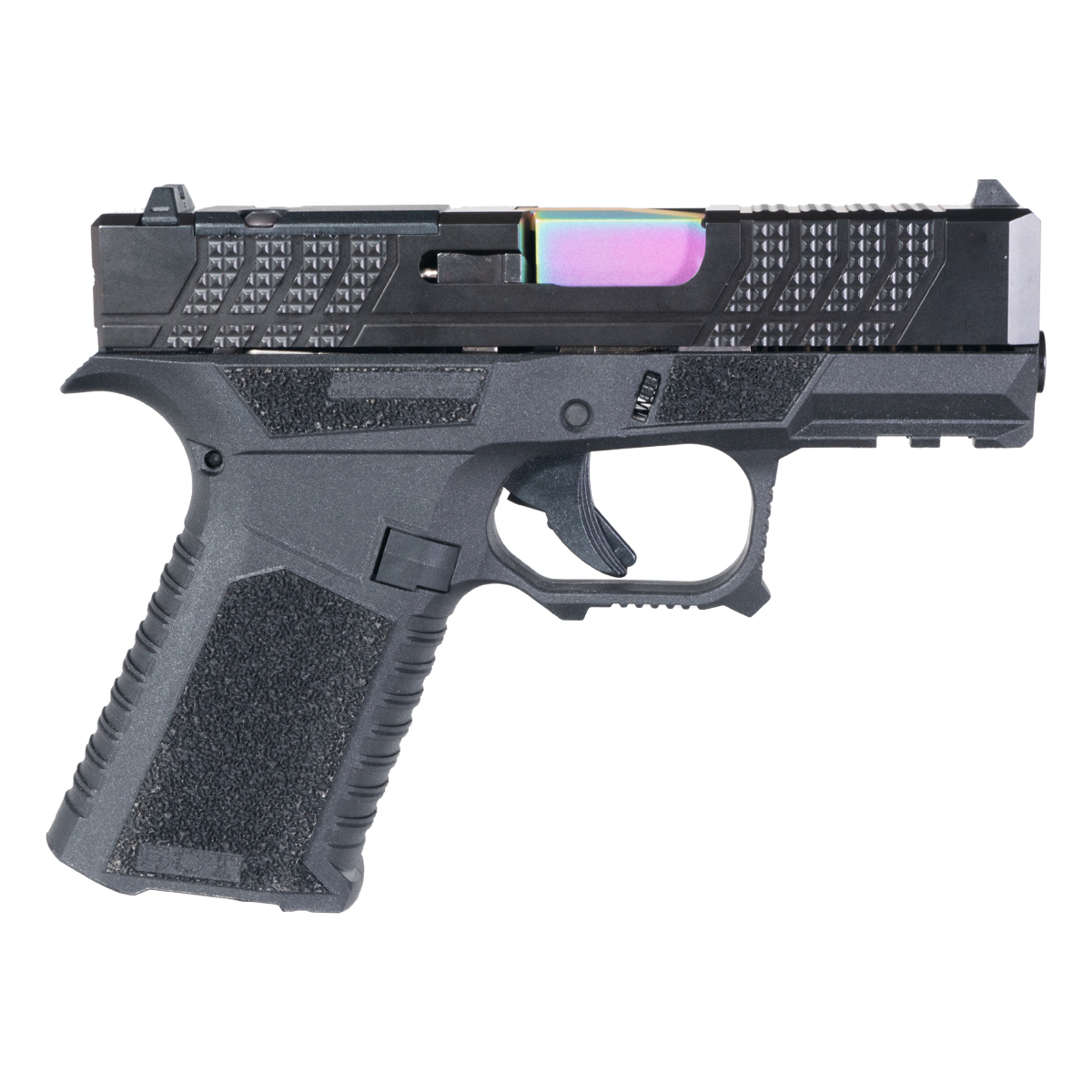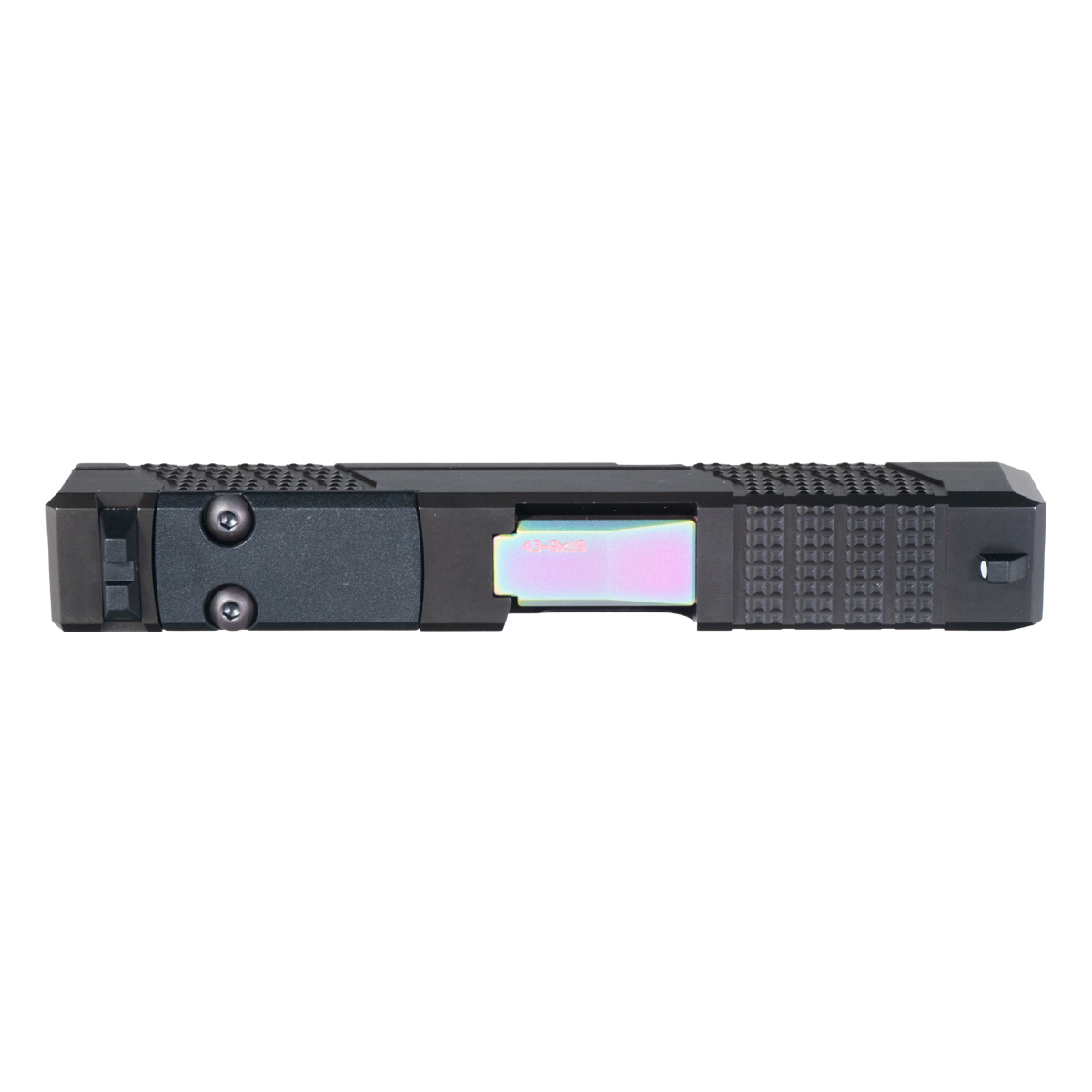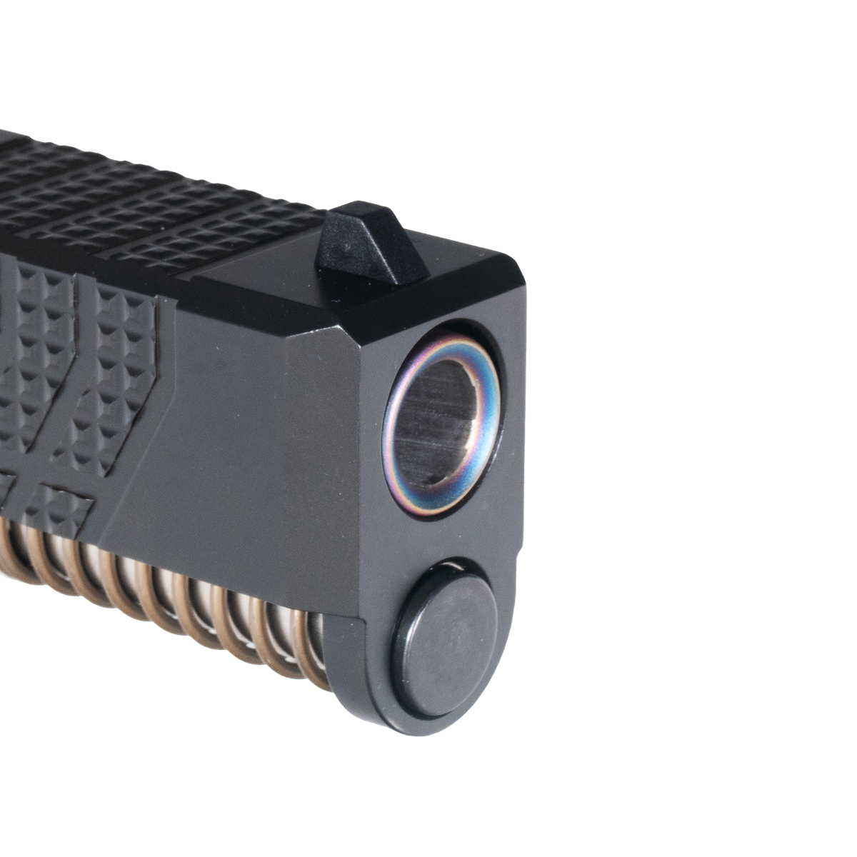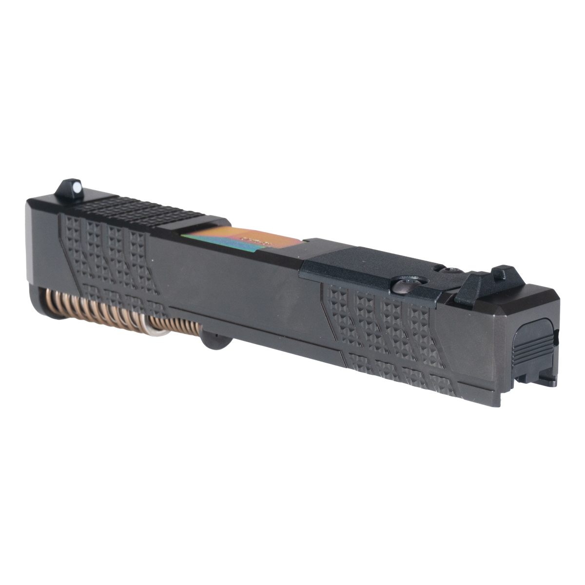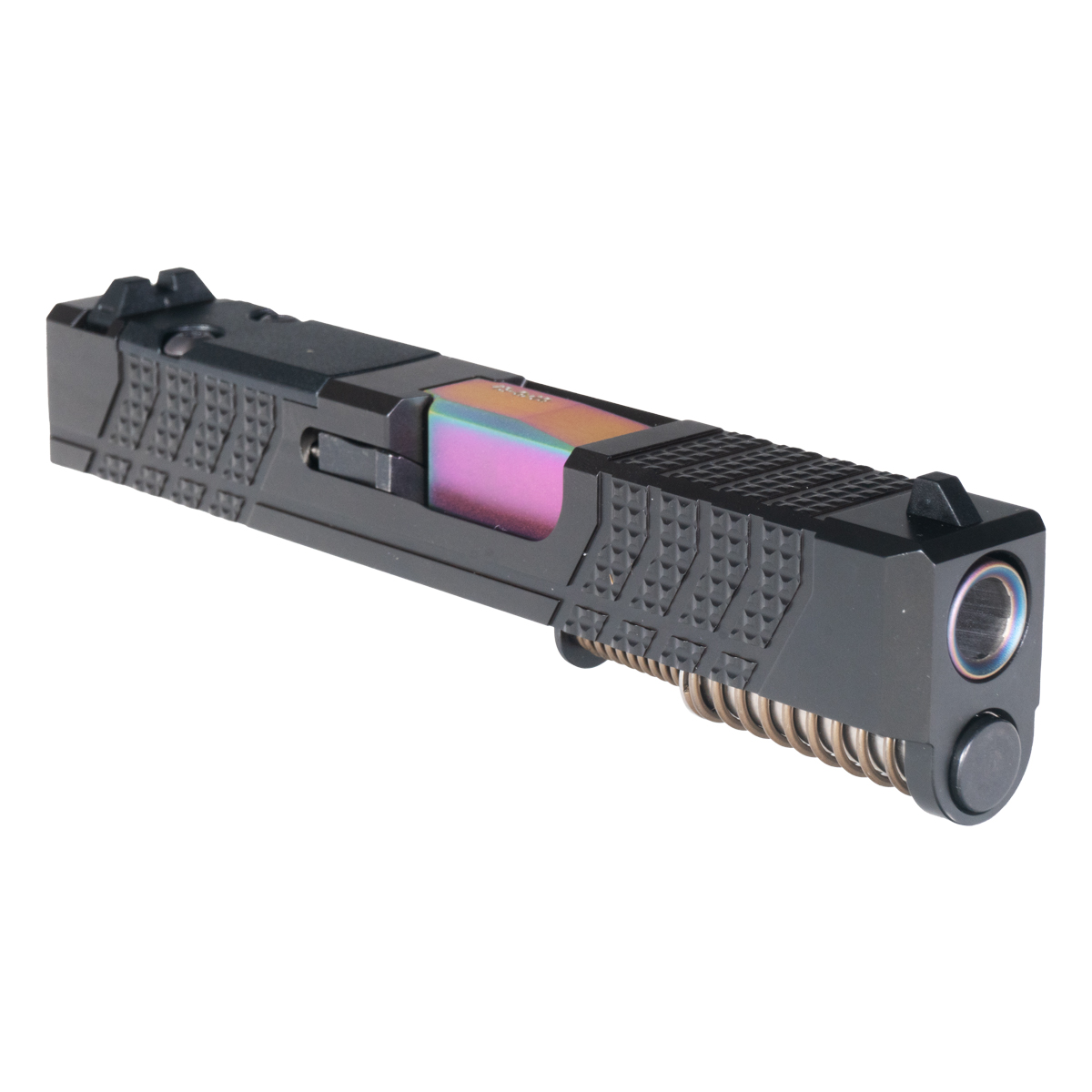 Black Nitride Slide for Enhanced Durability: The complete slide is constructed from 416R stainless steel with black nitride finish, offering robust corrosion resistance and enhanced toughness for demanding applications. Aggressive knurled serrations provide improved grip for press checks, slide manipulation, and one-handed operation in adverse conditions. The precision machining ensures tight tolerances for reliable cycling and consistent lockup, while the black nitride treatment penetrates the steel surface for hardness superior to standard coatings, maintaining dimensional accuracy and sleek appearance that contrasts beautifully with the rainbow barrel.