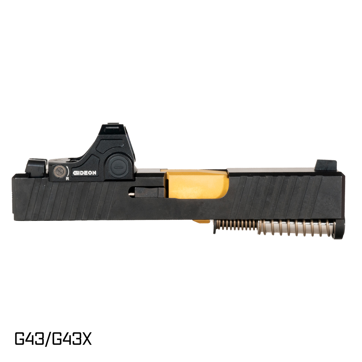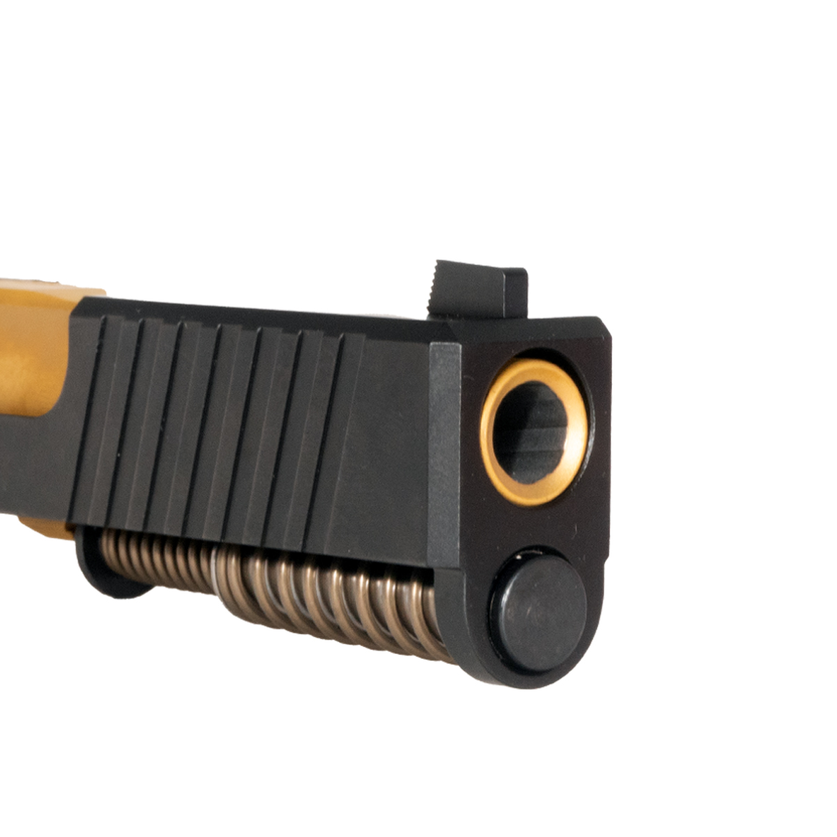 The Sentinel Gold TiN Barrel G43 Compatible 9MM RMSc Complete Slide Kit is a precision firearm accessory ideal for gunsmiths and enthusiasts. This kit, compatible with the G43 and G43X platforms, features a black nitride slide with both front and rear serrations for improved handling. The barrel, crafted from 416 steel with a striking titanium nitride finish, offers a twist rate of 1:10, ensuring reliable performance.