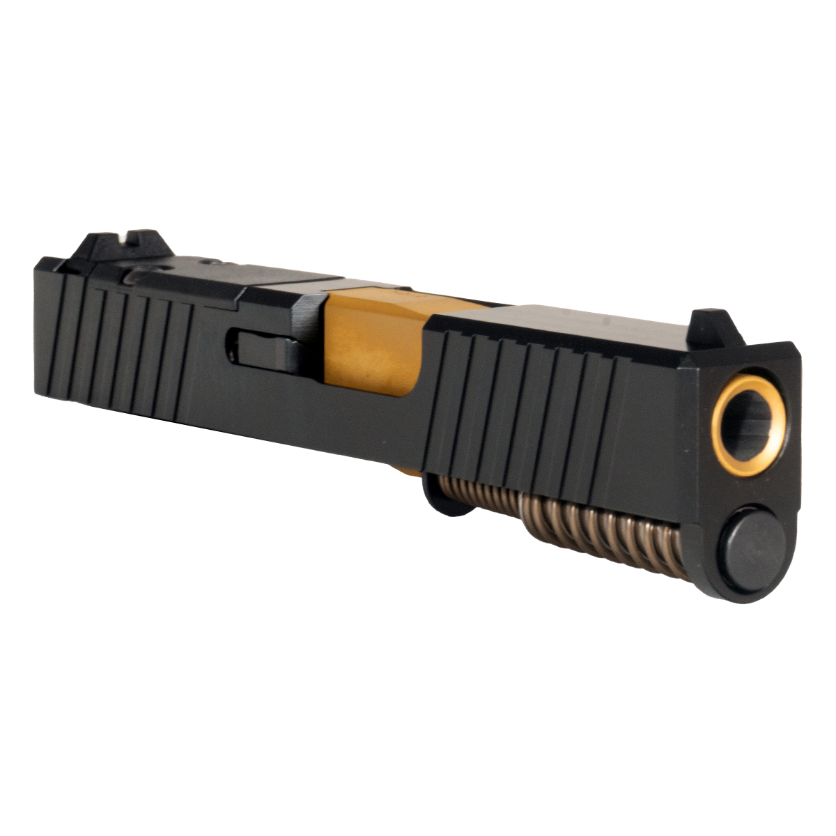 The Sentinel Gold TiN Barrel G43 Compatible 9MM Black RMSc Complete Slide Kit from Davidson Defense is a robust solution for firearm enthusiasts seeking reliable functionality and customization options. This complete slide kit includes a precision-engineered 9MM barrel made from durable 416 steel with a striking gold titanium nitride finish. The barrel features a 1:10 twist rate for optimal performance.