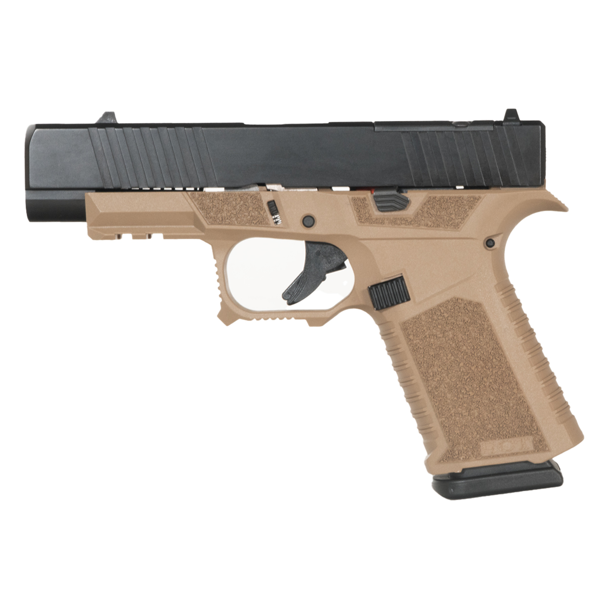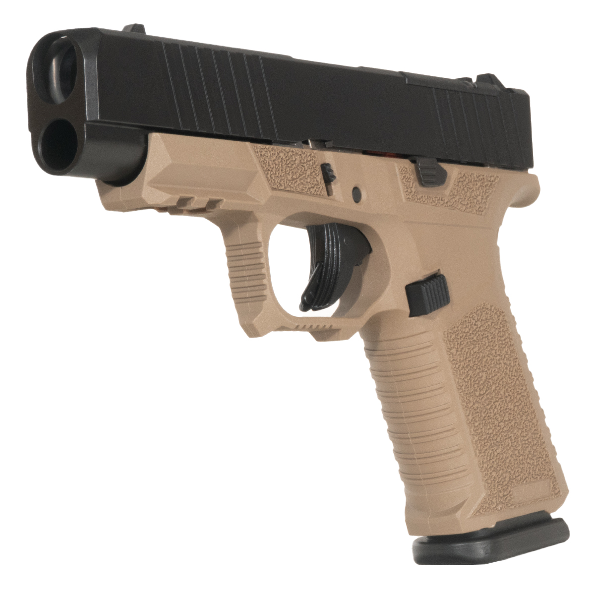 The handgun includes a complete assembly with an integrated compensator designed to reduce recoil and improve control, alongside a slide cut for RMSc red dot optics, making target acquisition faster. The flat dark earth (FDE) frame is made of nylon reinforced polymer for robustness and features a low-profile short sight assembly. This complete system accommodates G43X magazines with a 10-round capacity, providing a reliable and compact solution for users seeking a versatile handgun setup.