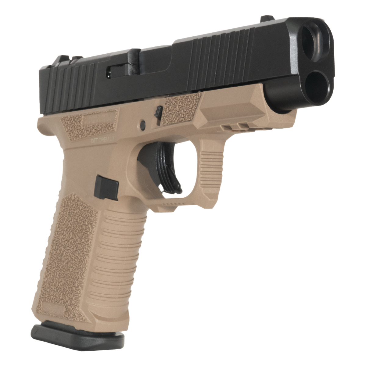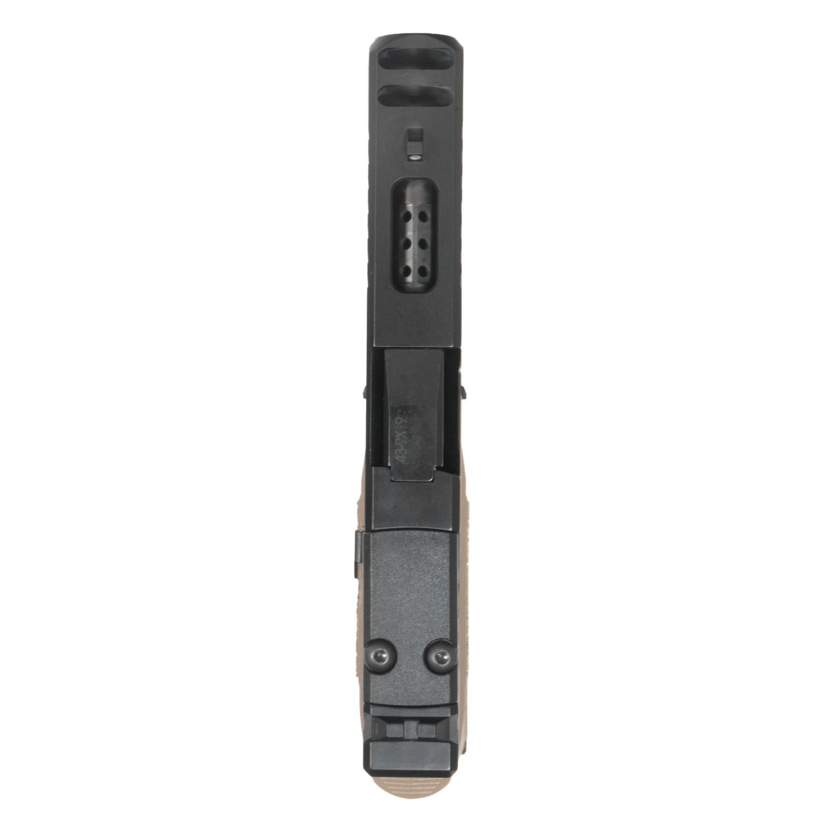 The Sentinel Ported Nitride Barrel G43x Compatible 9MM FDE RMSc Integrated Comp Complete Handgun from DTT combines performance and functionality tailored for the Glock 43/43X platforms. It features a 4150 CrMoV ported barrel with a black nitride finish, ensuring durability and resistance against corrosion. The barrel has a 1:10 twist rate for optimal accuracy with 9mm (9x19) ammunition.