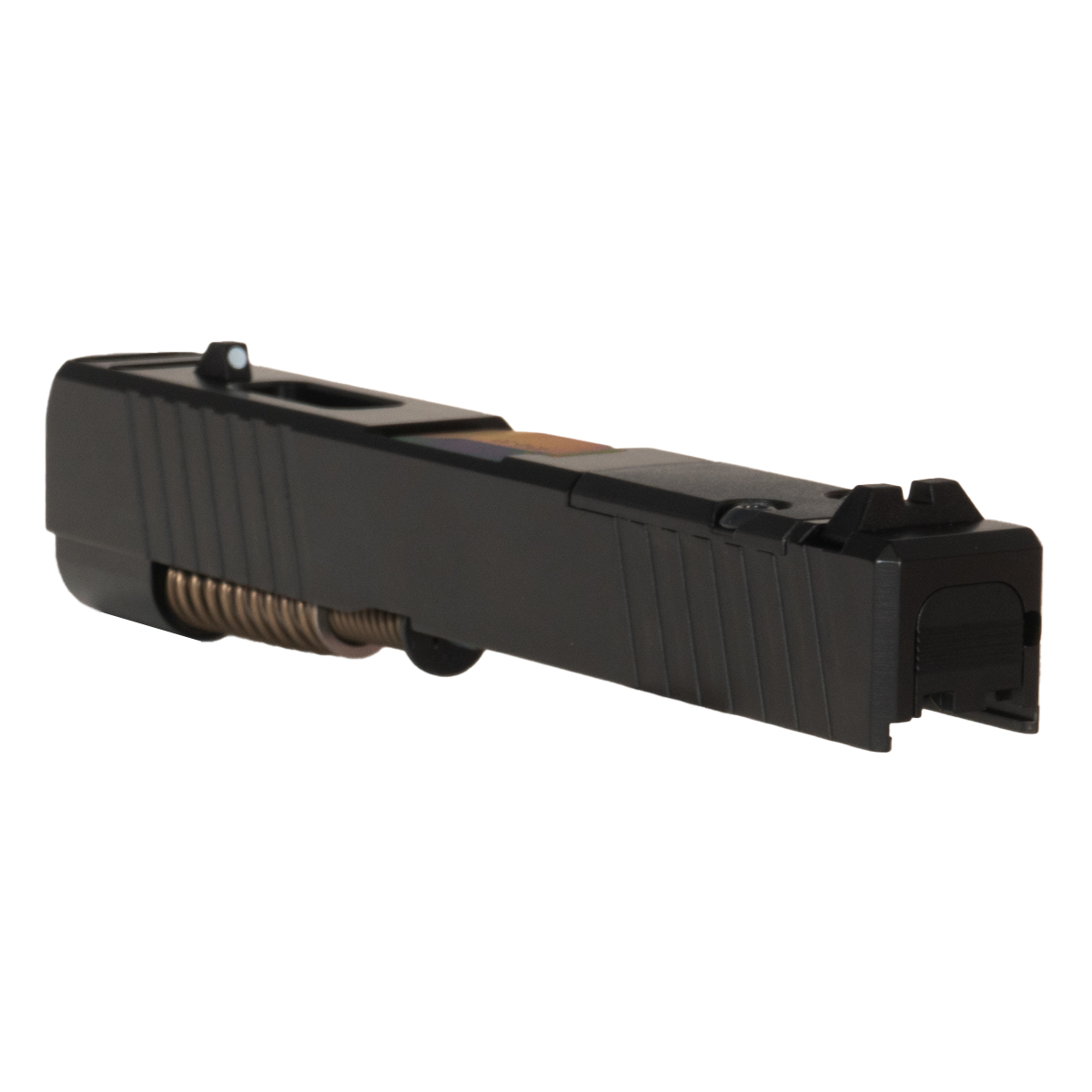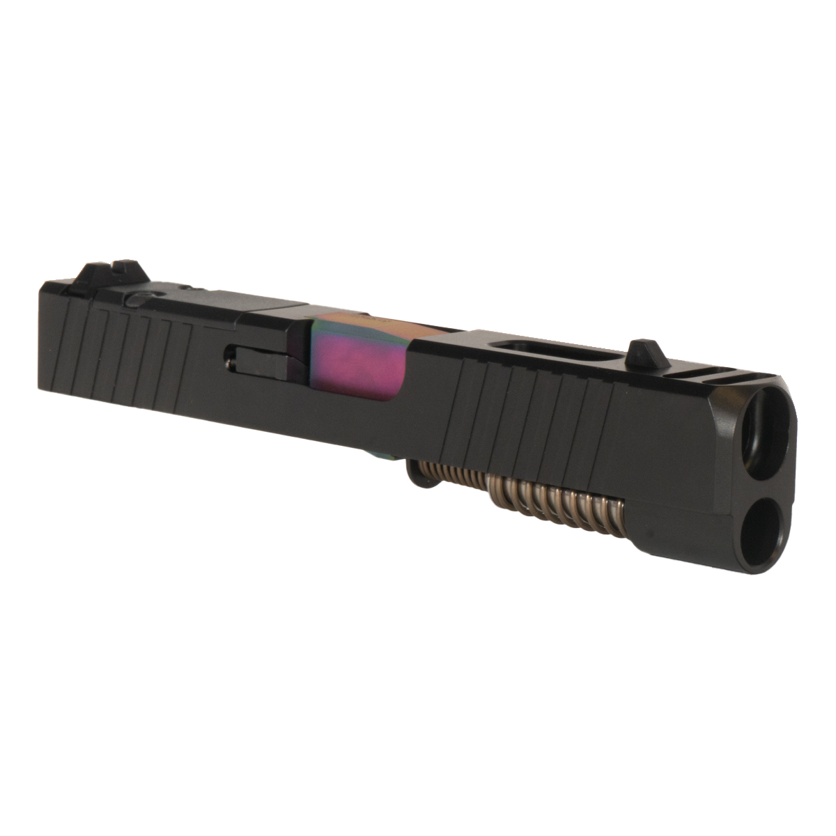The front and rear serrations provide enhanced grip and handling. The included barrel boasts a vibrant rainbow PVD finish, constructed from 416 steel with a 1:10 twist rate for exceptional accuracy. Additionally, the low-profile front and rear sight assembly ensures effective targeting. This complete slide kit combines aesthetic appeal with functional performance, making it a suitable choice for skilled gunsmiths who value precision and reliability.