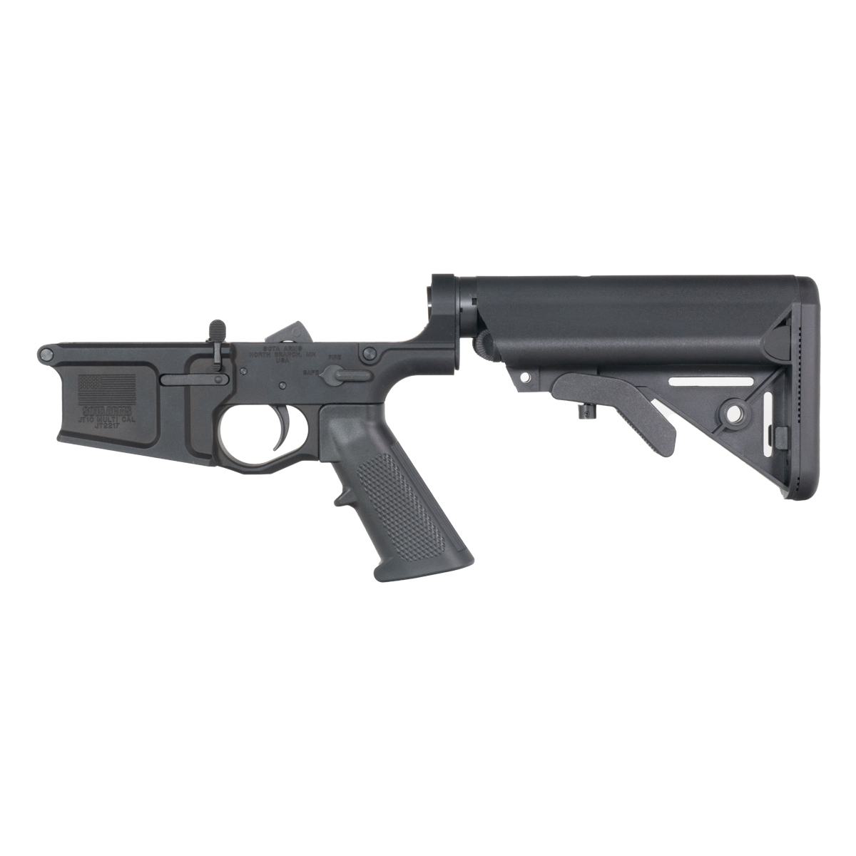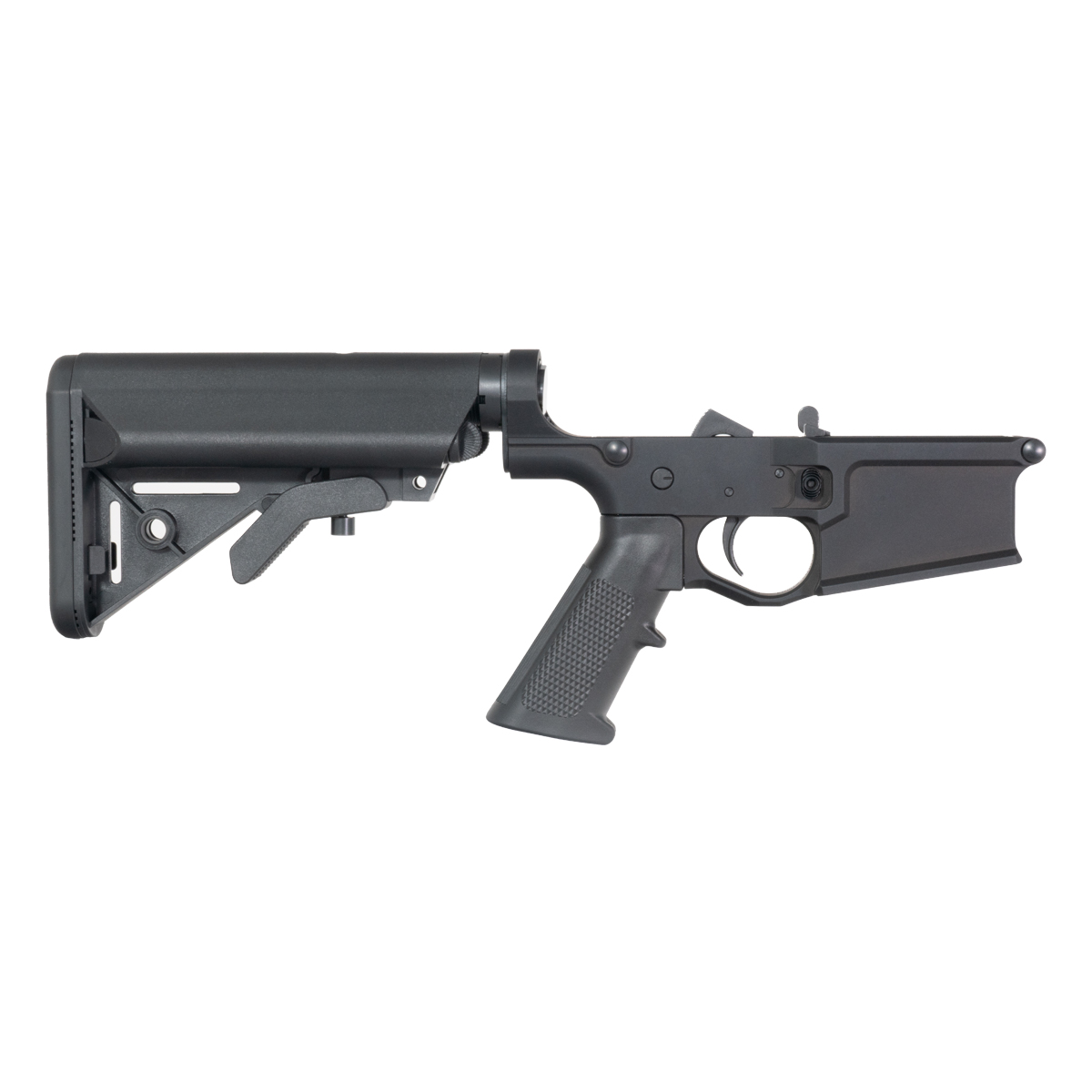 The assembly is complemented by a Mil-Spec receiver end plate and castle nut, both in a phosphate finish. The kit is topped off with a SOPMOD style collapsible stock made from nylon reinforced polymer, featuring storage compartments, making it practical for various shooting scenarios. This lower build kit is well-suited for gunsmiths who value functionality and quality in their builds.