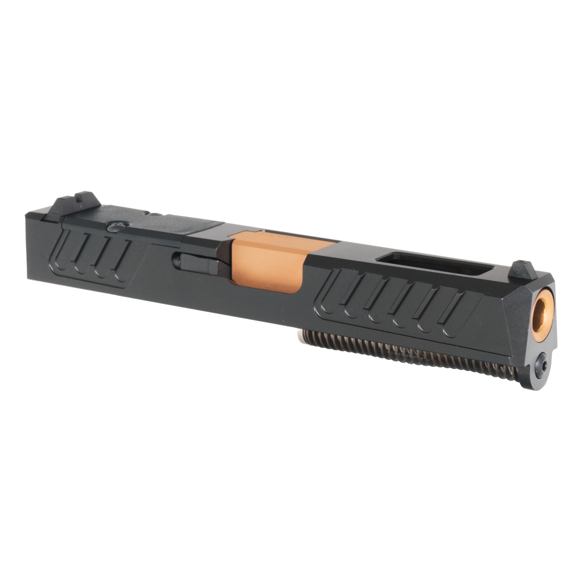 The Stiletto Ported Copper PVD Barrel G19 Gen 1-3 Complete Slide Kit offers precision engineering and reliable performance for your Glock 19 platform. This kit includes a black slide compatible with Glock generations 1 through 3 and features an RMR cut for easy optics mounting. The precision ported barrel, made from high-quality steel, has a copper PVD finish that adds durability and an aesthetic edge.