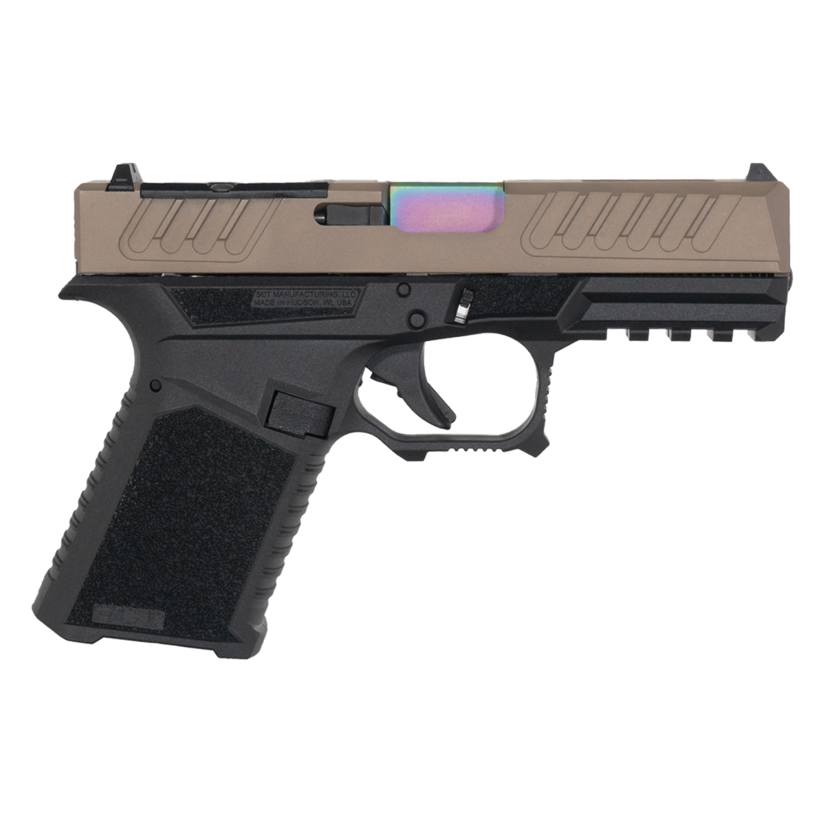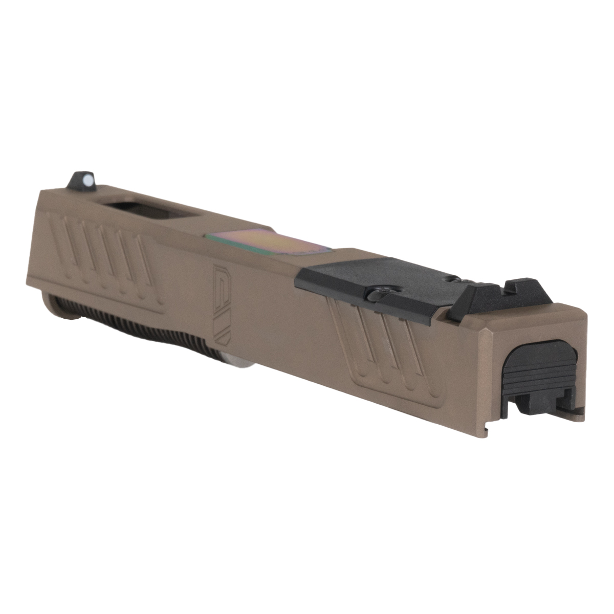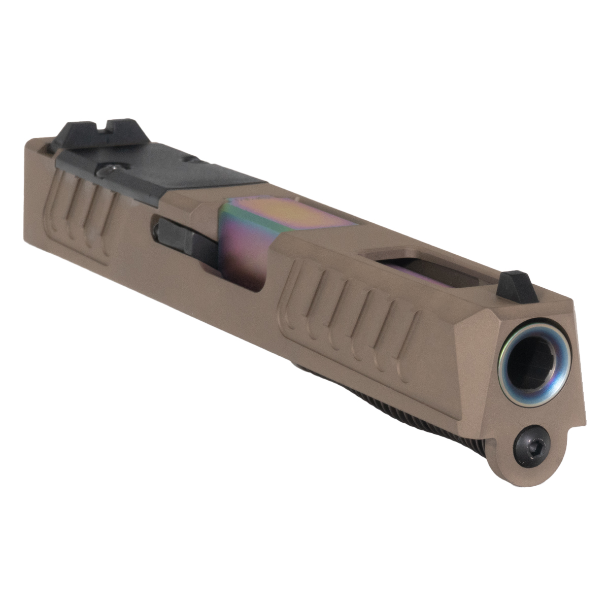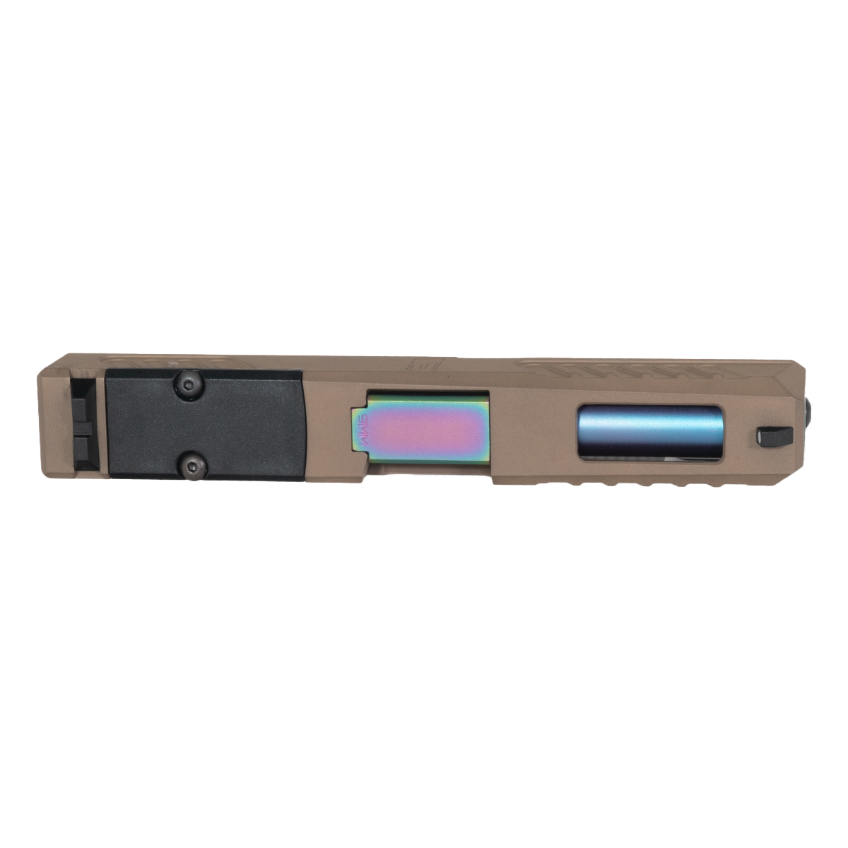 The slide, known as the Stiletto Slide RMR Cut, is finished in a Flat Dark Earth (FDE) color and is designed with an RMR cut for red dot sight integration. This complete kit includes a short sight assembly plastic kit in black, allowing for easy installation and customization. With its robust construction and standout aesthetics, the Stiletto Rainbow PVD Barrel Complete Slide Kit is a reliable option for gunsmiths who value both functionality and style in their firearms.