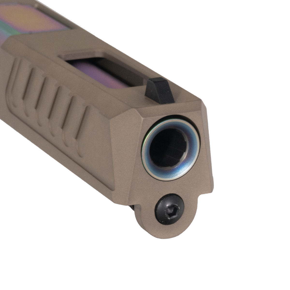 The Stiletto Rainbow PVD Barrel Complete Slide Kit is engineered for Glock 19 Gen 1-3 compatibility and delivers exceptional performance in a striking package. Featuring a Glock 19 Compatible Flush Cut Crown Barrel made from high-quality 416R stainless steel, this kit offers precision engineering for 9MM caliber shooting. The barrel twist rate is set at 1:10, ensuring optimal accuracy.