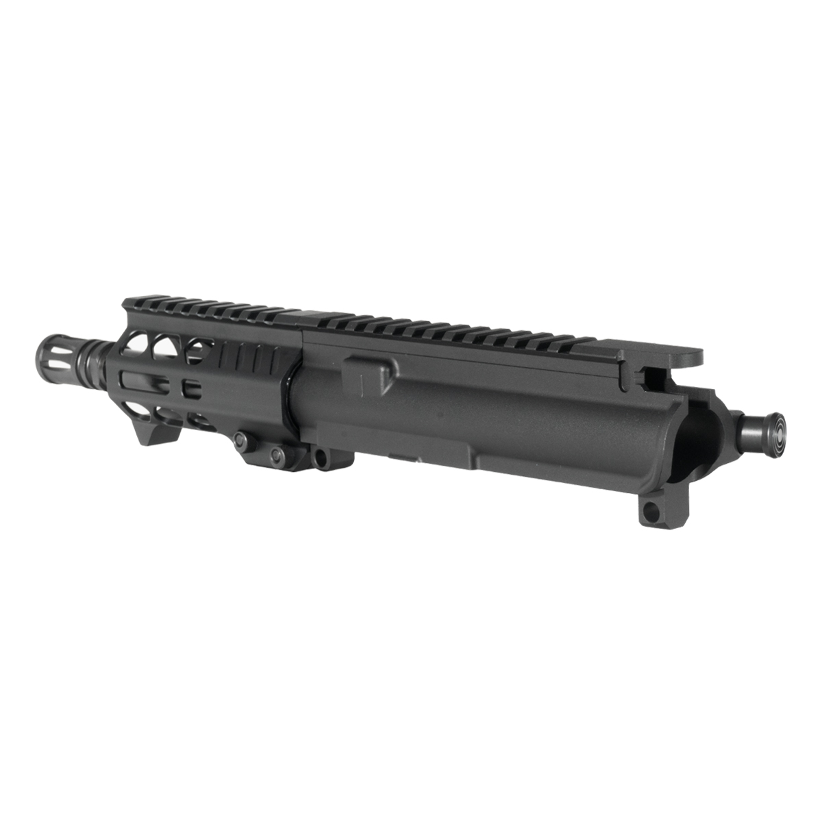 The 4.2-inch freefloat M-Lok handguard is constructed from 7075-T6 aluminum with M-Lok slots along its length, providing compatibility with a wide range of M-Lok accessories. The 8620 alloy steel nitride-finished 9mm bolt carrier group includes an external extractor and is compatible with Glock and Colt magazines. A mil-spec AR-15 charging handle is also a specified inclusion in this configuration.
