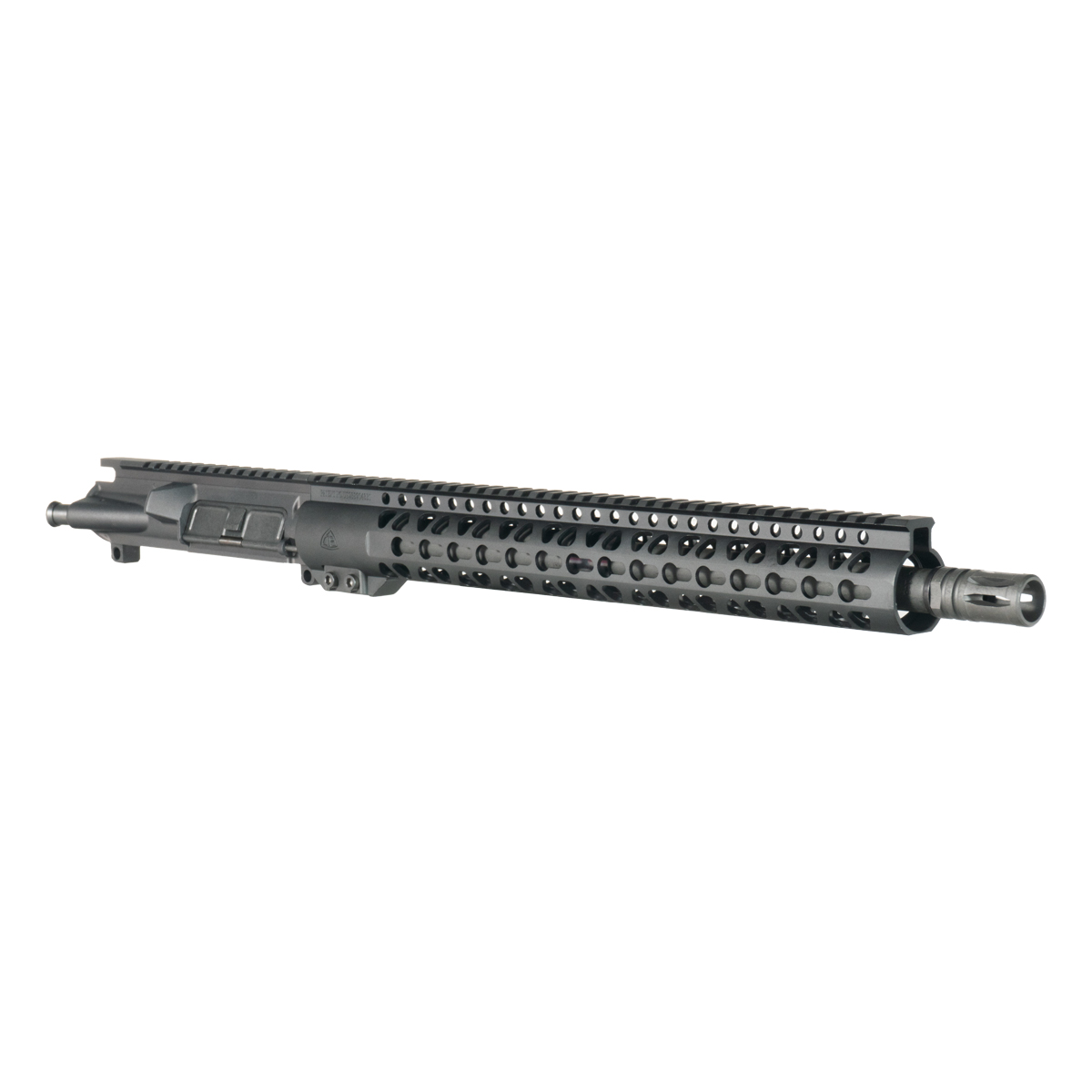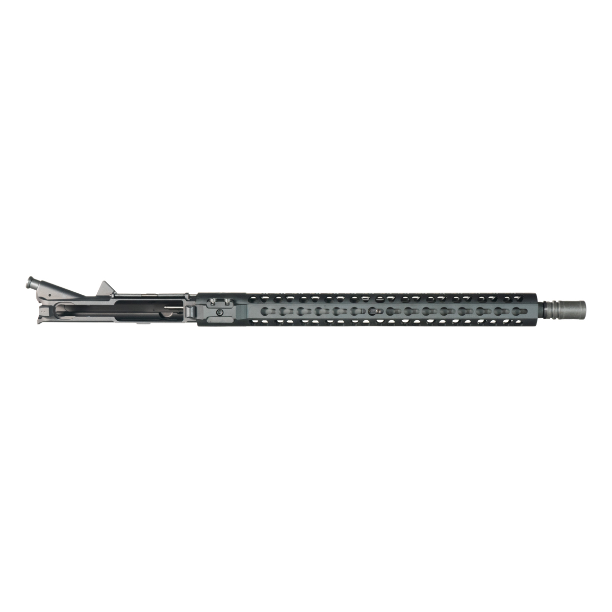 The 15 inch freefloat Keymod handguard extends nearly to the muzzle and allows you to attach lights, grips, bipods, and other accessories using Keymod compatible mounts. The anti-rotation tabs lock into corresponding slots in the upper receiver, preventing the handguard from rotating or shifting under stress or accessory weight. This maintains zero for any mounted sights or lasers and ensures consistent return to zero if the handguard is removed and reinstalled. The freefloat design means the handguard does not contact the barrel, eliminating pressure points that can shift point of impact as the barrel heats. The 7075-T6 aluminum upper receiver features M4 feed ramps machined into the barrel extension interface, improving feeding reliability with a wide range of bullet profiles and magazine types.