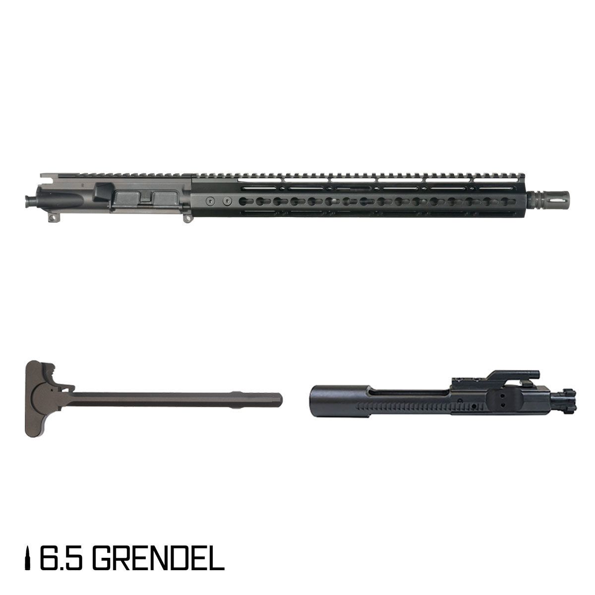 The 6.5 Grendel II bolt carrier group carries a QPQ nitride finish and is an included component in this complete upper. The QPQ nitride finish is a recognized protective finish specification within the AR-15 platform. The Mil-Spec AR-15 M4 charging handle and standard AR-15 birdcage flash hider round out the complete upper component set.