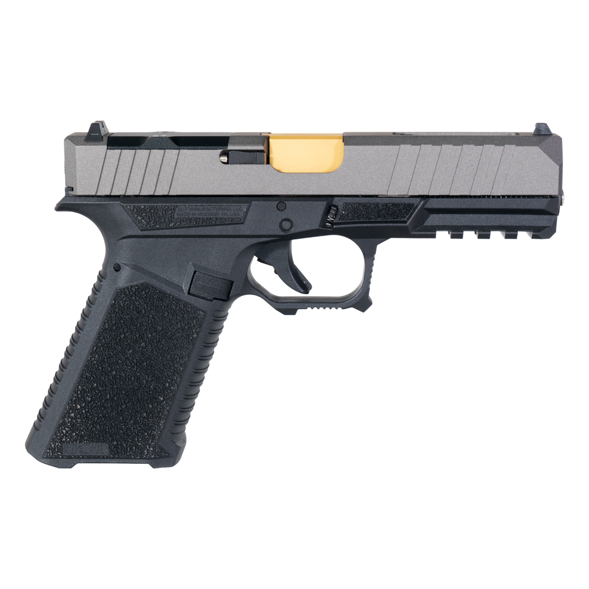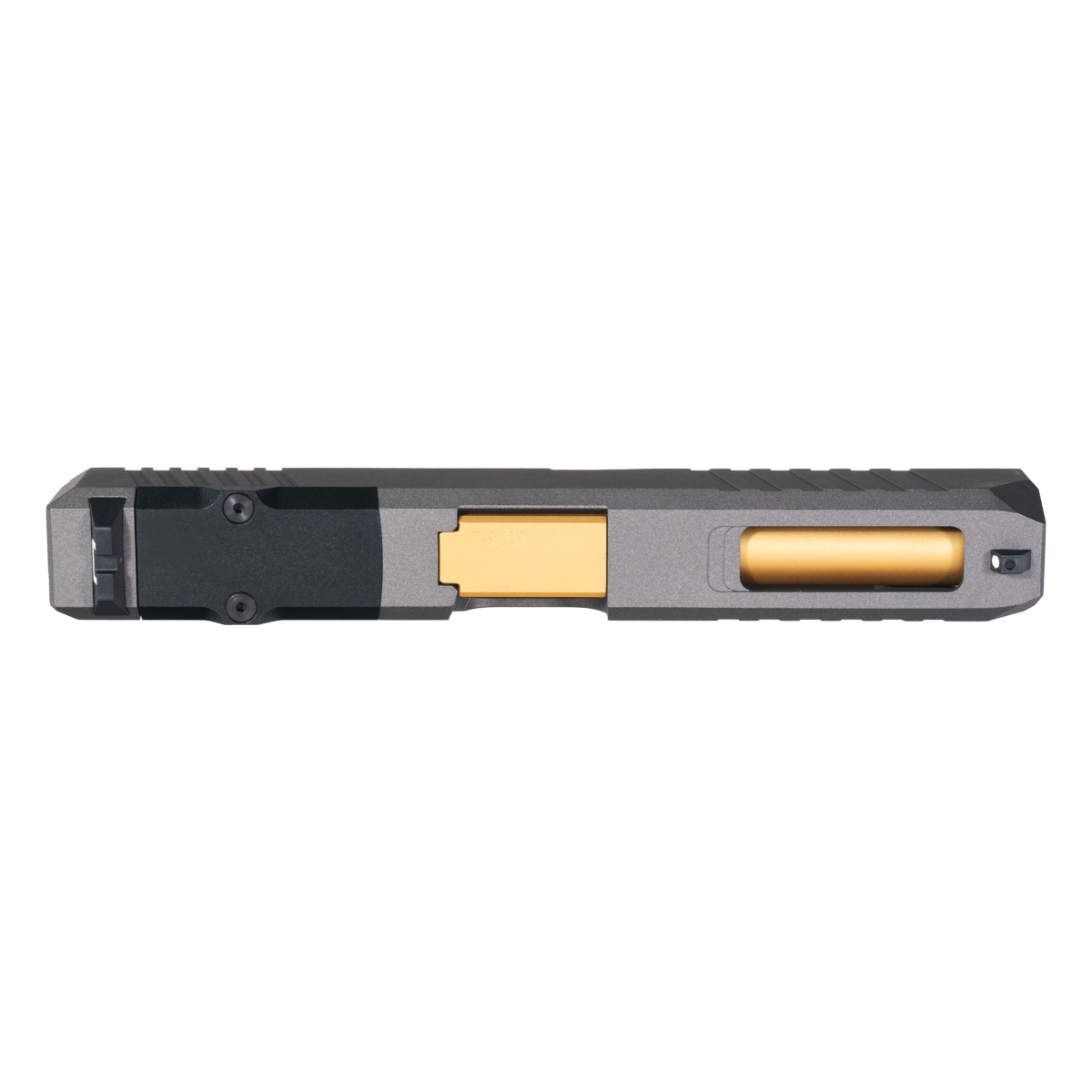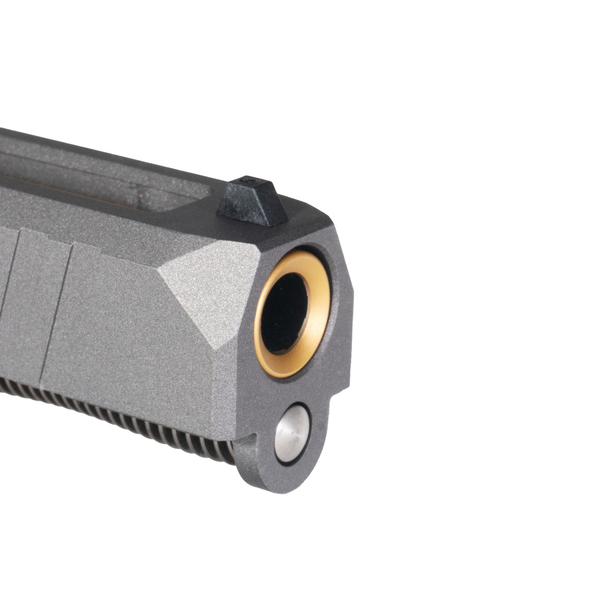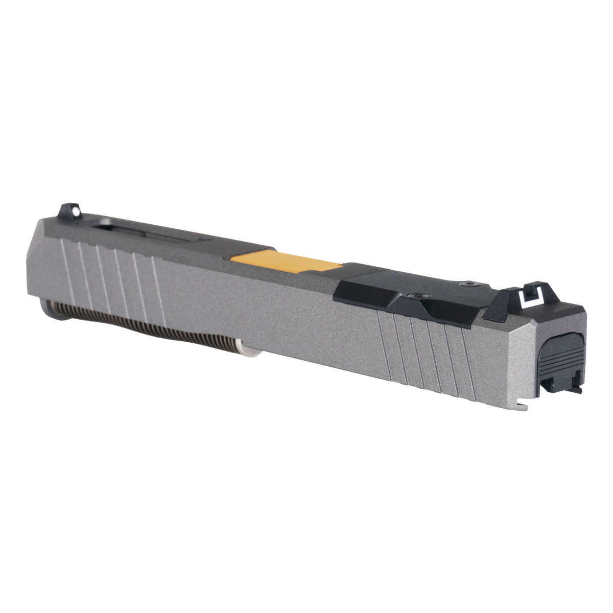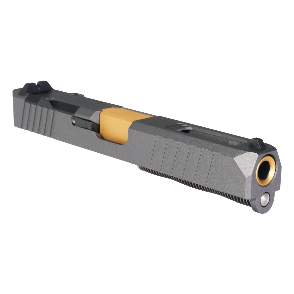 17-4 Stainless Steel Turbo Slide with Tungsten Cerakote: Constructed from 17-4 stainless steel providing robust performance and structural integrity for demanding competition and tactical applications. The 17-4 material offers excellent corrosion resistance and wear characteristics while maintaining dimensional stability through high-round-count use. The tungsten Cerakote finish ensures longevity and resistance to wear, creating distinctive grey tone that contrasts beautifully with the gold TiN barrel for striking two-tone appearance. This finish protects the slide from environmental exposure, holster wear, and operational stress while maintaining professional appearance essential for custom builds and competition guns.