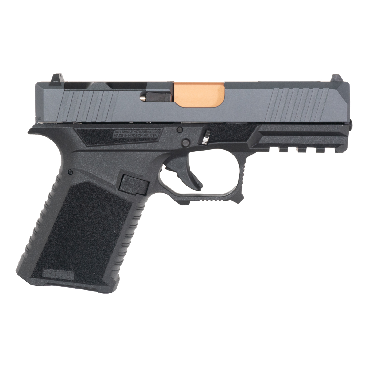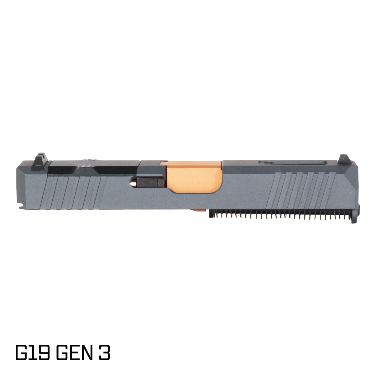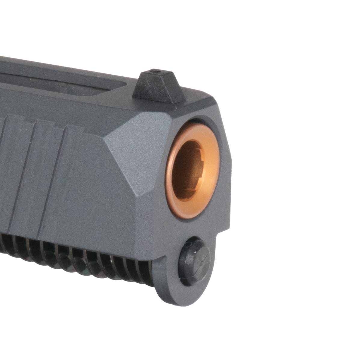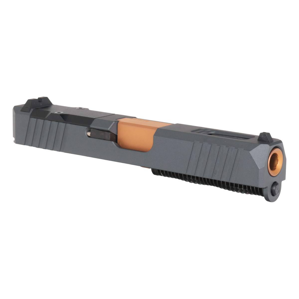 The Wayfinder Crowned Midnight Bronze PVD Barrel G19 Gen 1-3 Compatible 9MM Sniper Gray RMR Complete Slide Kit from DTT Stiffler MFG is engineered for the discerning gunsmith who values precision and performance. This kit is compatible with Glock 19 platforms and features a 9mm (9x19) caliber barrel, crafted from 416R stainless steel. The G19 Barrel boasts a Crown Cut in a striking Copper Finish, enhanced with a Midnight Bronze PVD for durability and style.
